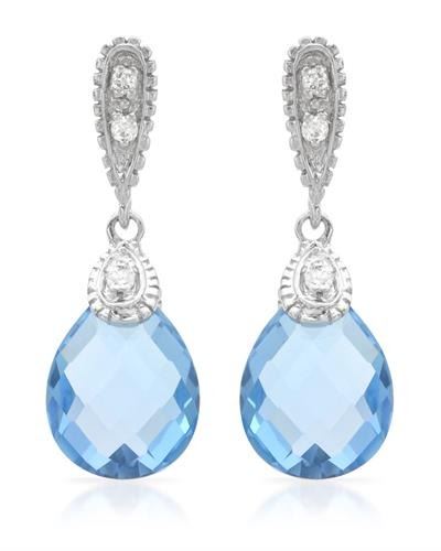 One 14KT White Gold 6.25ctw Blue Topaz and Diamond Earrings. (2) Blue Topaz stones with a total weight of 6.25cts. (8) round Diamonds with a total weight of 0.10cts with a color of I and clarity of I-1. Measuring 22mm x 8mm. Total weight of these earrings are 2.3 grams.