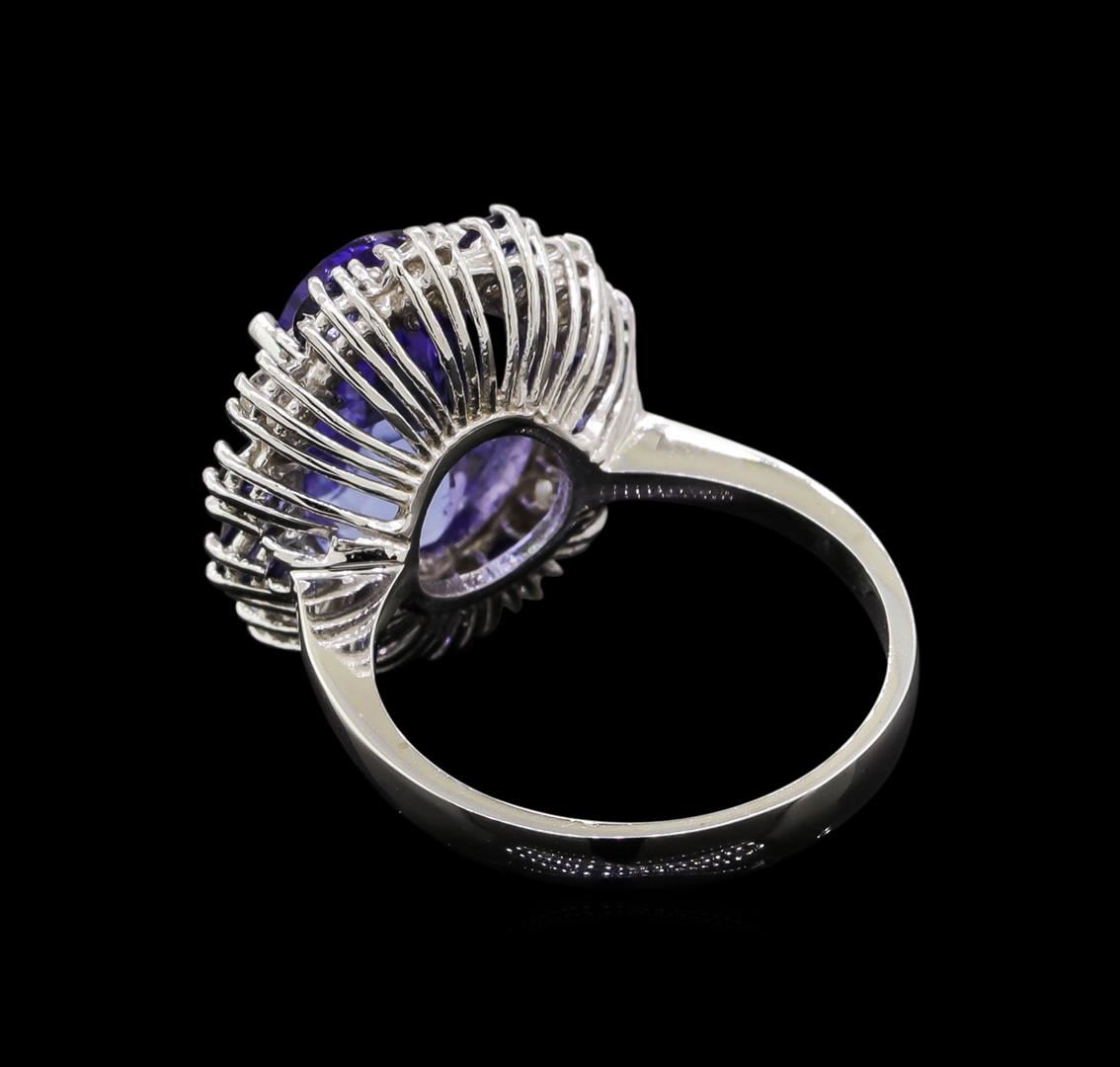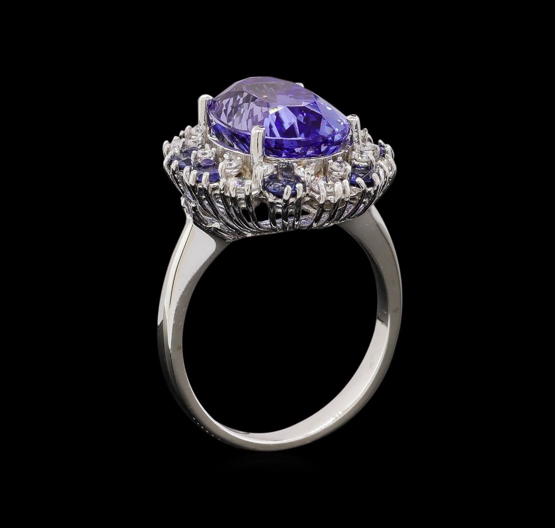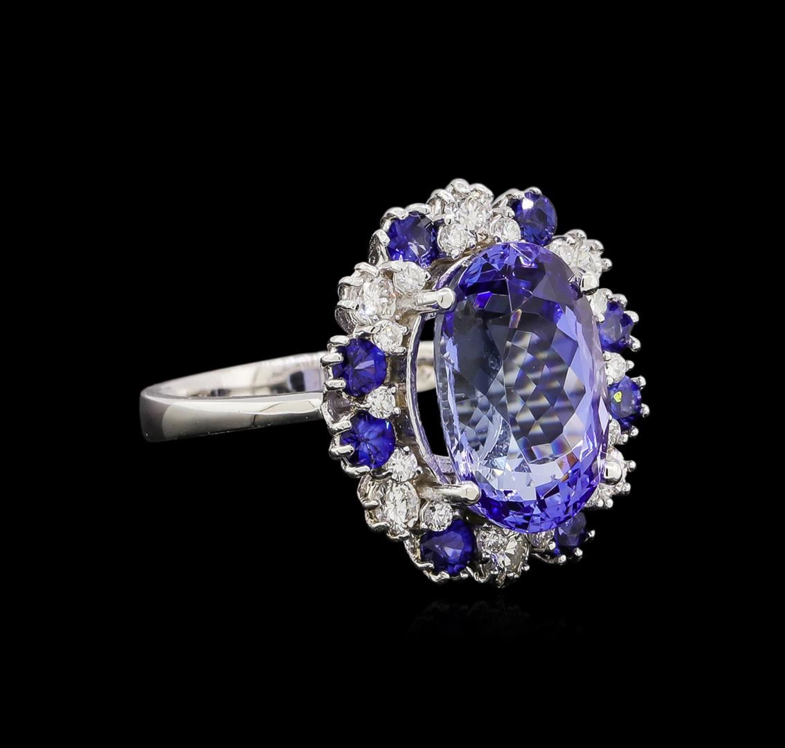One electronically tested 14KT white gold ladies cast tanzanite, sapphire and diamond ring with a bright polish finish. Identified with markings of "14K". Condition is new. Containing: One prong set oval modified brilliant cut natural tanzanite, measuring 13.60 x 9.10 x 7.20mm, approximate weight of 6.27ct., clarity is eye clean, type I, medium light, slightly grayish, violet color, (GIA V 4/2), cut is good. Eight prong set round modified brilliant cut natural blue sapphires, measuring 2.60 - 2.60 x 1.69 mm, approximate total weight of 0.72ct., clarity is slightly included, type II, medium, moderately strong, blue color, (GIA B 5/4), cut is good. Six prong set round brilliant cut diamonds, measuring 2.50 - 2.50 x 1.50mm (depth est.) approximate total weight of 6 Stones = 0.34ct. Clarity: SI-1 to SI-2. Color: I - J, Cut is Good. Fourteen prong set round brilliant cut diamonds, measuring 1.30 - 1.30 x 0.78mm (depth est.) approximate total weight of 14 Stones = 0.11ct. Clarity: SI-1 to SI-2. Color: I - J, Cut is Good. Colored gemstones are presumed to have been subjected to commonly used enhancement processes. All diamonds and colored gemstones are graded in the mounting, unless otherwise stated. Total Weight of Colored Stones 6.99ct. Total Weight of Diamonds 0.46ct. Total Weight of Ring 6.30 grams. GGL Appraised.