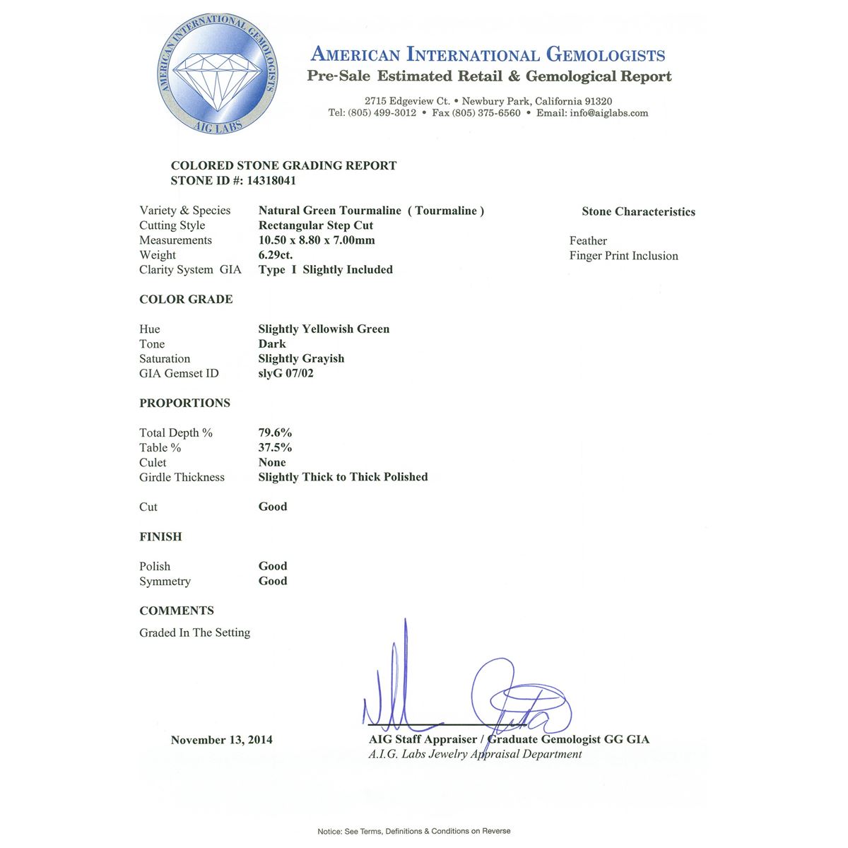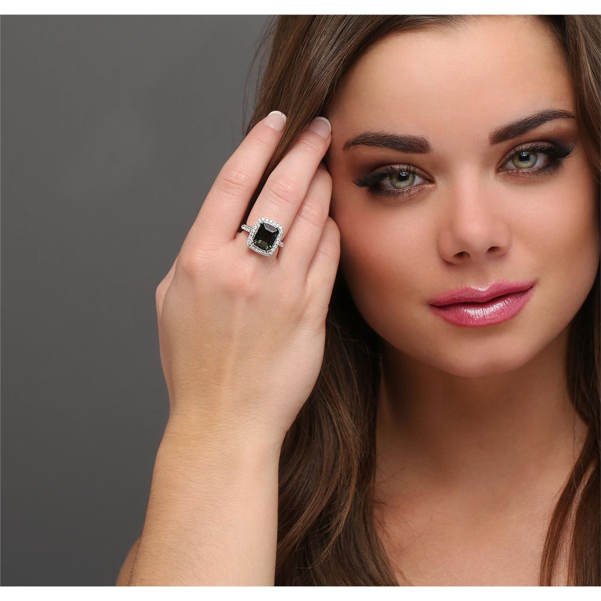 One electronically tested 14KT white gold ladies cast green tourmaline and diamond ring with a bright polish finish. The featured green tourmaline is set within a diamond bezel supported by diamond set shoulders, completed by a two and one-half millimeter wide band. Identified with markings of "K14". Condition is new, good workmanship. Containing: One prong set rectangular step cut natural green tourmaline, measuring 10.50 x 8.80 x 7.00mm, 6% bulge factor, approximate weight of 6.29ct., clarity is slightly included, type I, dark, slightly grayish, slightly yellowish green color, (GIA slyG 7/2), cut is good. Transmitting light with a minimum of distortion, transparent. Naturally occurring internal & external characteristics are present. Colored Stone Grading Report attached. Graded in the setting. Thirty-Six prong set round brilliant cut diamonds, measuring 1.80 - 1.70 x 1.05mm (depth est.) approximate total weight of 36 Stones = 0.80ct. Graded in the setting. Clarity SI-2 to I-1. Color G - I. Total Weight of Colored Stones 6.29ct. Total Weight of Diamonds 0.80ct. Total Weight of Ring 7.32 grams. AIG Appraised at $4,675.00.