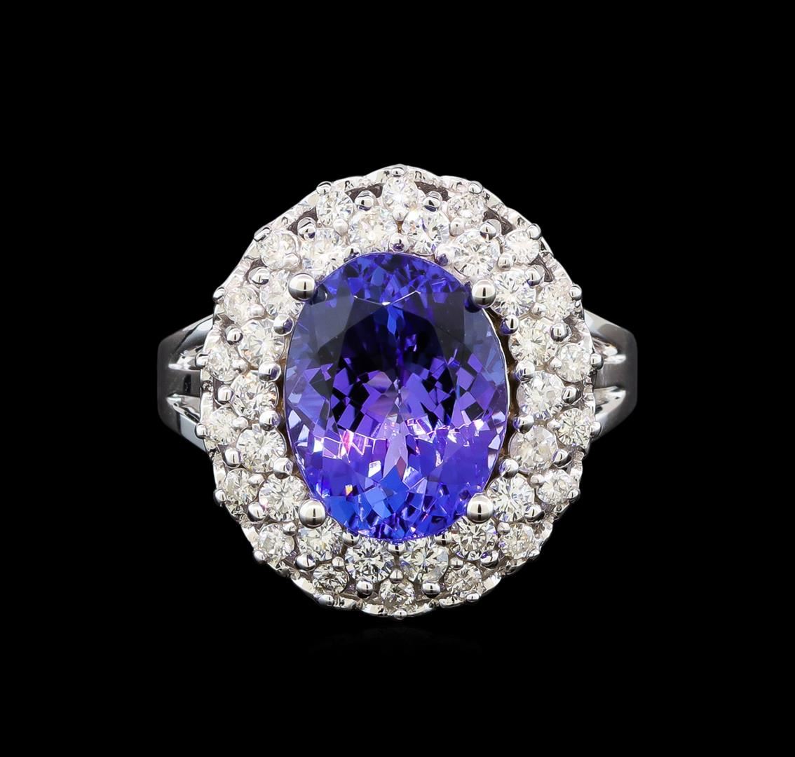 One electronically tested 14KT white gold ladies cast tanzanite and diamond ring with a bright polish finish. Identified with markings of "14K". Condition is new. Containing: One prong set oval modified brilliant cut natural tanzanite, measuring 12.98 x 10.02 x 7.00mm, approximate weight of 6.40ct., clarity is eye clean, type I, medium light, moderately strong, bluish violet color, (GIA bV 4/4), cut is good. Thirty-Six prong set round brilliant cut diamonds, measuring 2.10 - 1.50 x 1.08mm (depth est.) approximate total weight of 36 Stones = 0.77ct. Clarity: SI-1 to SI-2. Color: I - J, Cut is Good. Colored gemstones are presumed to have been subjected to commonly used enhancement processes. All diamonds and colored gemstones are graded in the mounting, unless otherwise stated. Total Weight of Colored Stones 6.40ct. Total Weight of Diamonds 0.77ct. Total Weight of Ring 10.30 grams. GGL Appraised at $8,215.00.