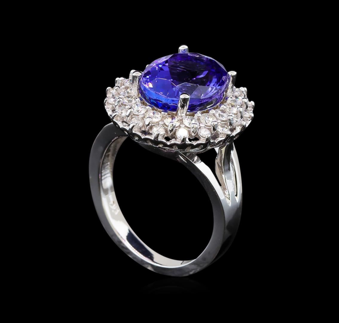 One electronically tested 14KT white gold ladies cast tanzanite and diamond ring with a bright polish finish. Identified with markings of "14K". Condition is new. Containing: One prong set oval modified brilliant cut natural tanzanite, measuring 12.98 x 10.02 x 7.00mm, approximate weight of 6.40 ct., clarity is eye clean, type I, medium light, moderately strong, bluish violet color, (GIA bV 4/4), cut is good. Thirty-Six prong set round brilliant cut diamonds, measuring 2.10 - 1.50 x 1.08mm (depth est.) approximate total weight of 36 Stones = 0.77ct. Clarity: SI-1 to SI-2. Color: I - J, Cut is Good. Colored gemstones are presumed to have been subjected to commonly used enhancement processes. All diamonds and colored gemstones are graded in the mounting, unless otherwise stated. Total Weight of Colored Stones 6.40 ct. Total Weight of Diamonds 0.77ct. Total Weight of Ring 10.30 grams. GGL Appraised.