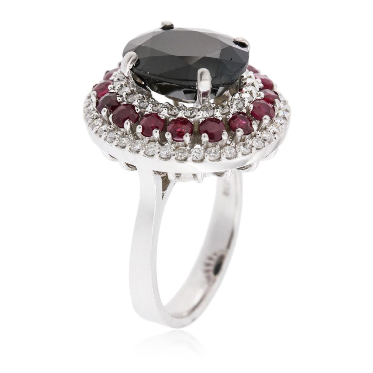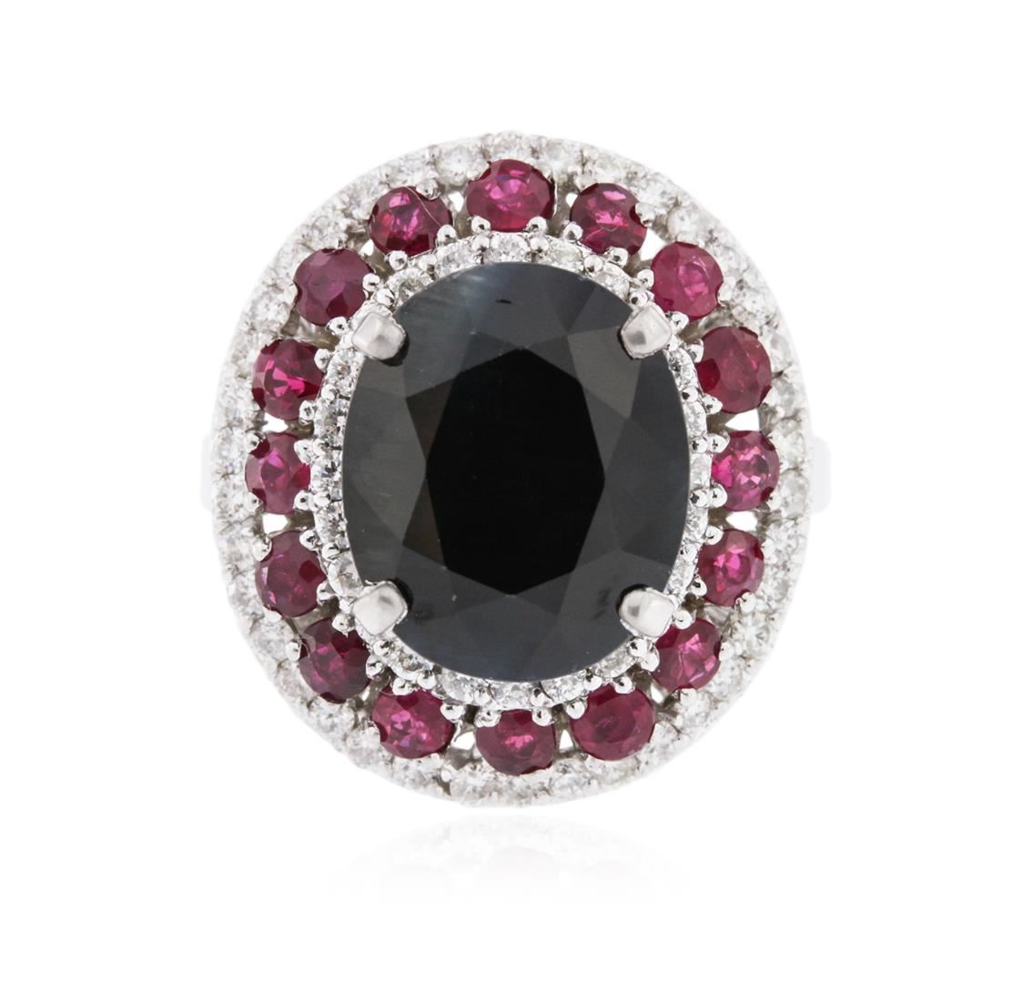One electronically tested 14KT white gold ladies cast ruby, sapphire and diamond ring with a bright polish finish. Identified with markings of "14K". Condition is new. Containing: One prong set oval modified brilliant cut natural blue sapphire, measuring 11.86 x 9.98 x 6.49mm, approximate weight of 6.45ct., clarity is heavily included, type II, very dark, strong, blue color, (GIA B 8/5), cut is good. Sixteen prong set round modified brilliant cut natural rubies, measuring 2.00 - 2.00 x 1.30 mm, approximate total weight of 0.64ct., clarity is moderately included, medium, moderately strong, strongly purplish red color, (GIA stpR 5/4), cut is good. Sixty prong set round brilliant cut diamonds, measuring 1.30 - 1.30 x 0.78mm (depth est.) approximate total weight of 60 Stones = 0.48ct. Clarity: SI-2 to I-1. Color: I - J, Cut is Good. Colored gemstones are presumed to have been subjected to commonly used enhancement processes. All diamonds and colored gemstones are graded in the mounting, unless otherwise stated. Total Weight of Colored Stones 7.09ct. Total Weight of Diamonds 0.48ct. Total Weight of Ring 8.90 grams. GGL Appraised at $4,550.00.