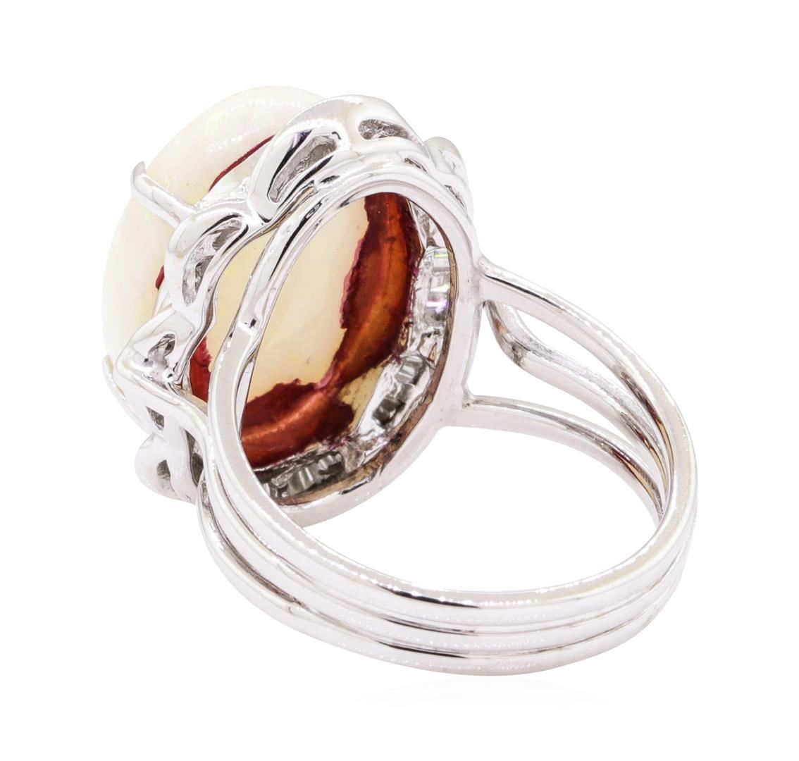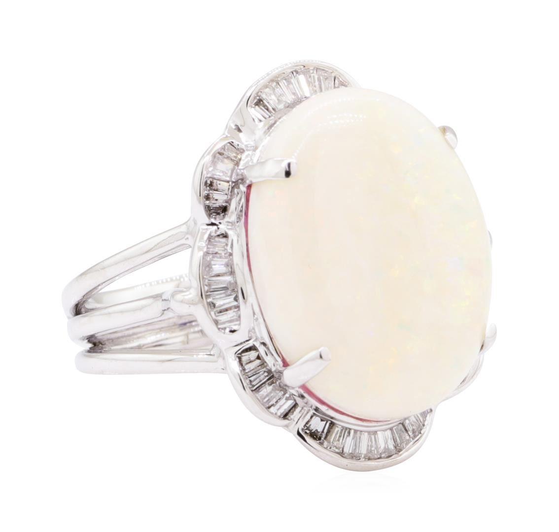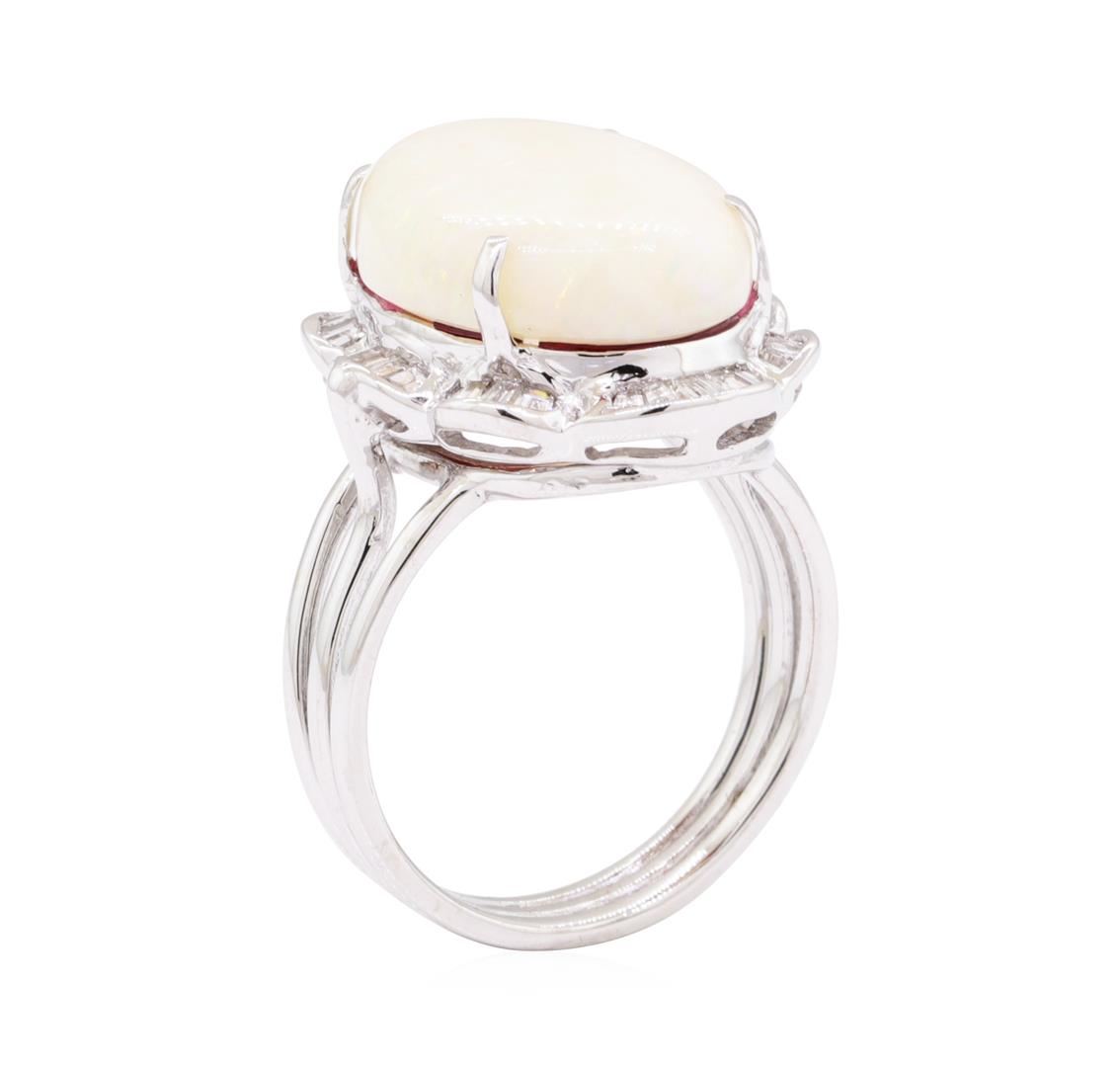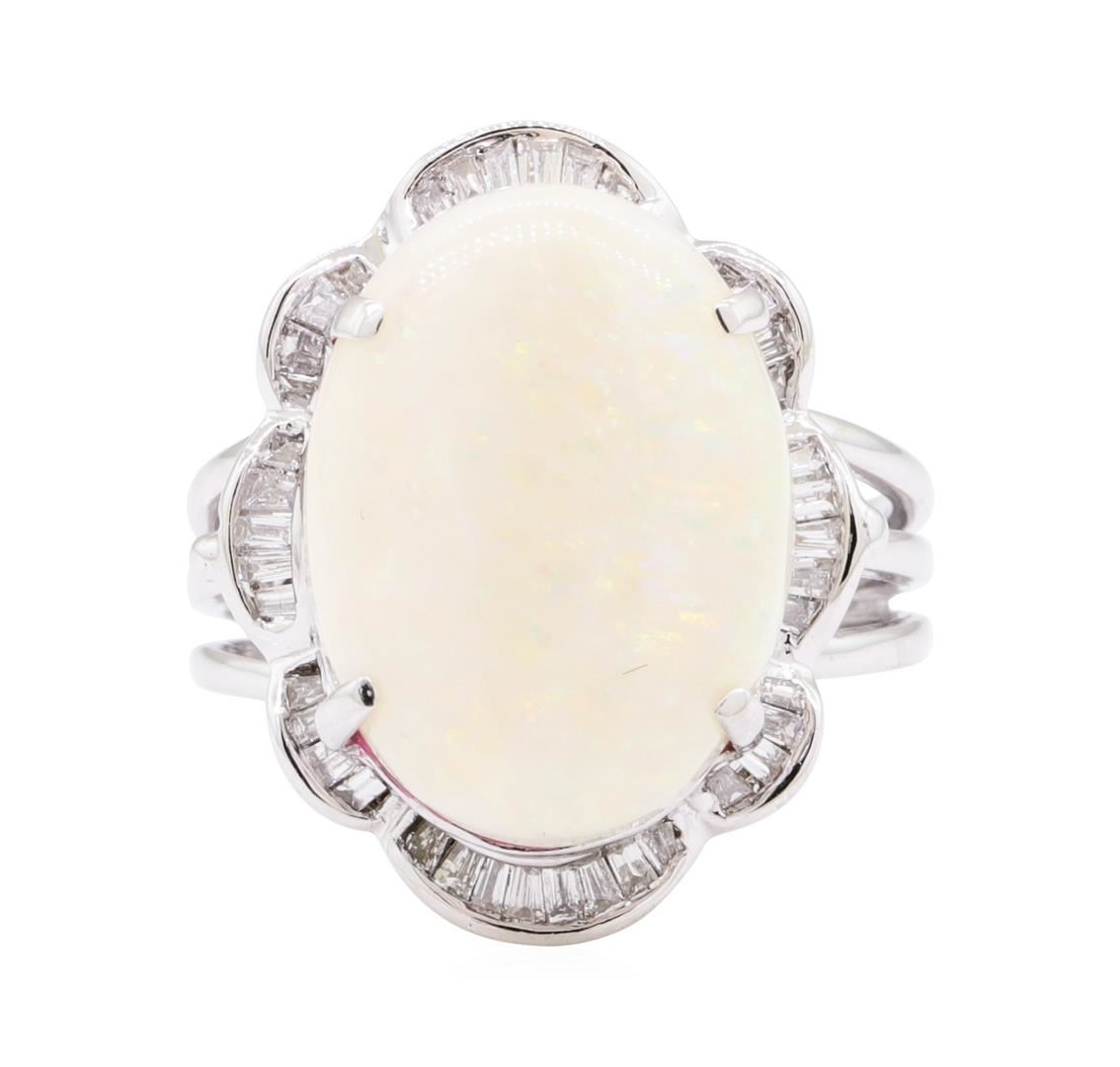 One ring featuring: 14KT white gold weighing 6.4 grams containing one opal weighign 6.00ct and diamonds weighing 0.50ctw. The ring is a size 6.