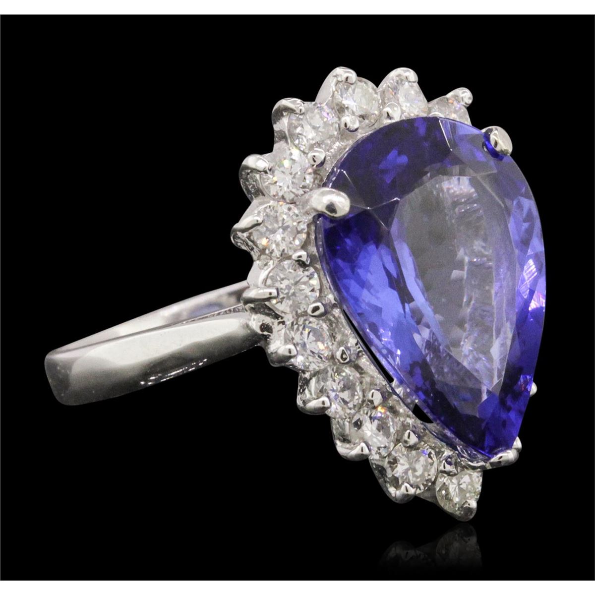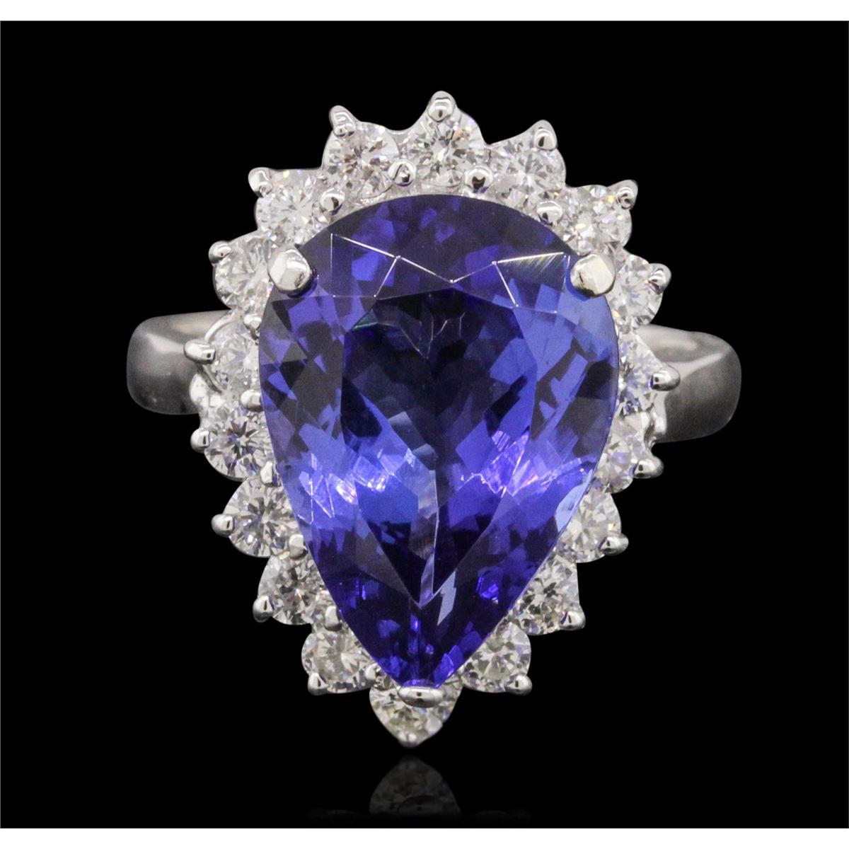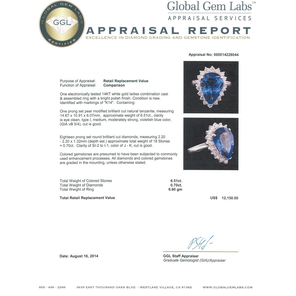 One electronically tested 14KT white gold ladies combination cast & assembled ring with a bright polish finish. Condition is new. Identified with markings of "K14". Containing: One prong set pear modified brilliant cut natural tanzanite, measuring 14.67 x 10.91 x 6.07mm, approximate weight of 6.51ct., clarity is eye clean, type I, medium, moderately strong, violetish blue color, (GIA vB 5/4), cut is good. Eighteen prong set round brilliant cut diamonds, measuring 2.20 - 2.20 x 1.32mm (depth est.) approximate. Total Weight of 18 Stones = 0.70ct. Clarity: SI-2 to I-1. Color: J - K, Cut is Good. Colored gemstones are presumed to have been subjected to commonly used enhancement processes. All diamonds and colored gemstones are graded in the mounting, unless otherwise stated. Total Weight of Colored Stones 6.51ct. Total Weight of Diamonds 0.70ct. Total Weight of Ring 6.60 grams. GGL Appraised at $12,150.00.