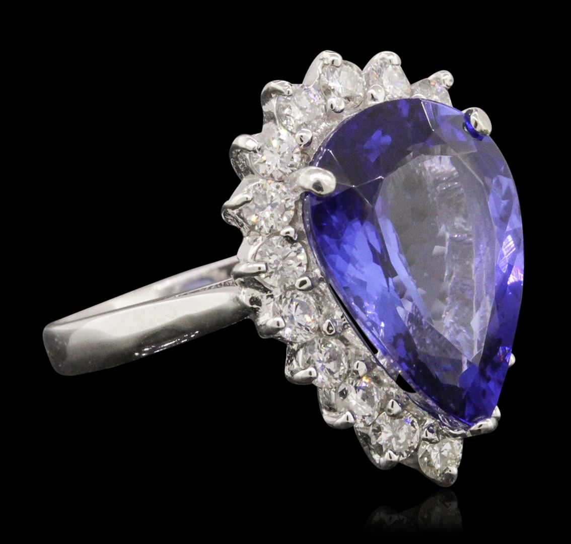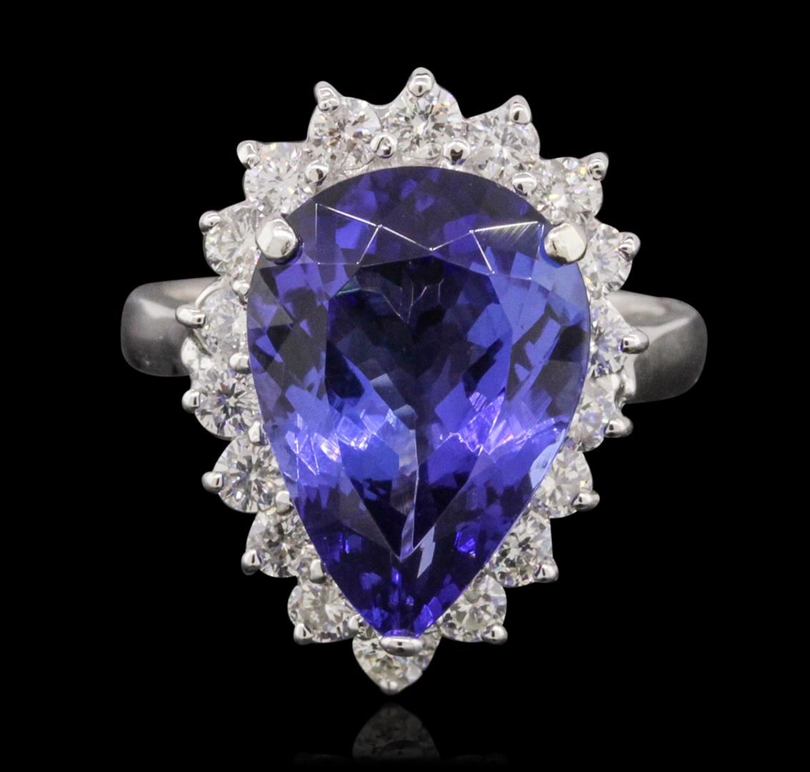 One electronically tested 14KT white gold ladies combination cast & assembled ring with a bright polish finish. Condition is new. Identified with markings of "K14". Containing: One prong set pear modified brilliant cut natural tanzanite, measuring 14.67 x 10.91 x 6.07mm, approximate weight of 6.51ct., clarity is eye clean, type I, medium, moderately strong, violetish blue color, (GIA vB 5/4), cut is good. Eighteen prong set round brilliant cut diamonds, measuring 2.20 - 2.20 x 1.32mm (depth est.) approximate. Total Weight of 18 Stones = 0.70ct. Clarity: SI-2 to I-1. Color: J - K, Cut is Good. Colored gemstones are presumed to have been subjected to commonly used enhancement processes. All diamonds and colored gemstones are graded in the mounting, unless otherwise stated. Total Weight of Colored Stones 6.51ct. Total Weight of Diamonds 0.70ct. Total Weight of Ring 6.60 grams. GGL Appraised at $12,150.00.