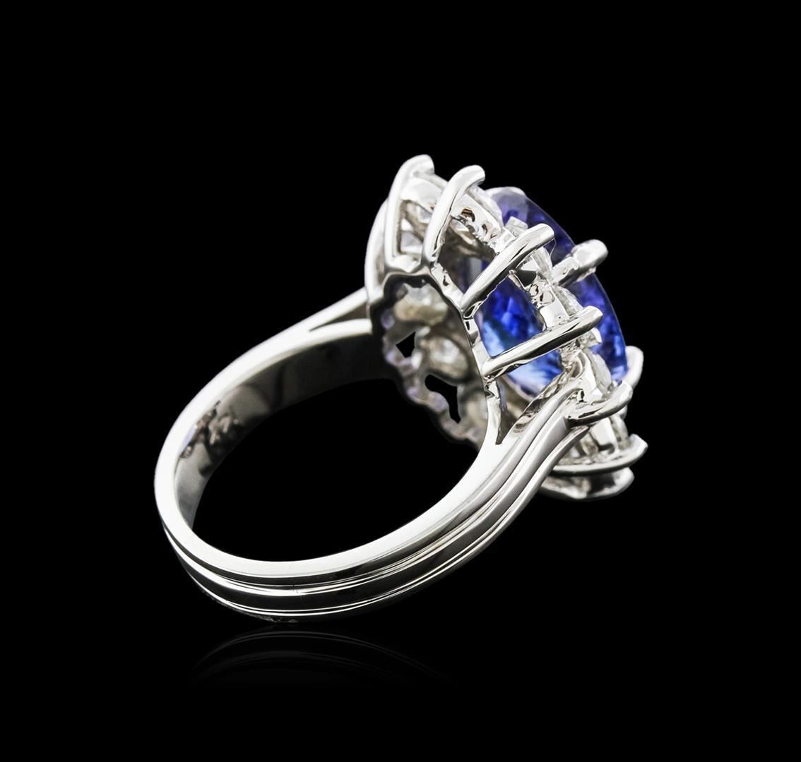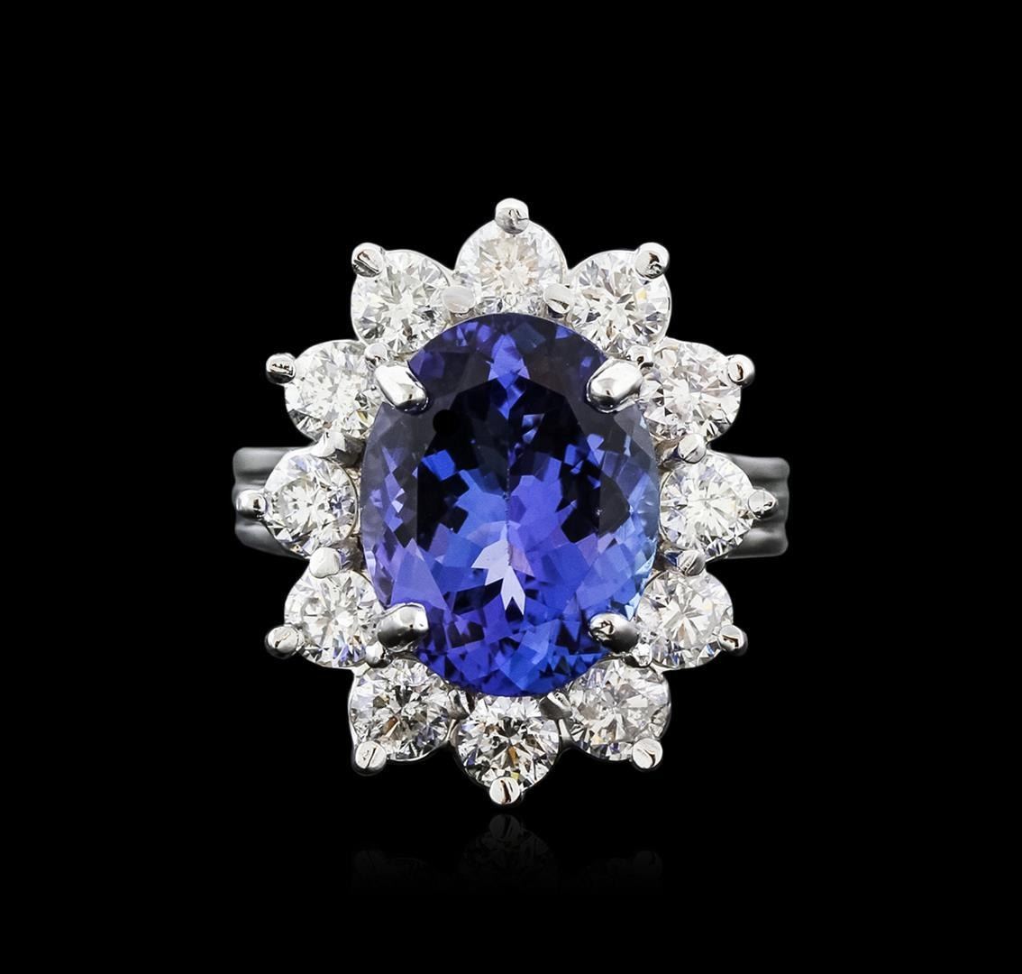 One electronically tested 14KT white gold ladies cast tanzanite and diamond ring with a bright polish finish. Identified with markings of "14K". Condition is new. Containing: One prong set oval modified brilliant cut natural tanzanite, measuring 13.26 x 10.41 x 6.77mm, approximate weight of 6.57ct., clarity is eye clean, type I, medium light, very slightly grayish, bluish violet color, (GIA bV 4/3), cut is good. Twelve prong set round brilliant cut diamonds, measuring 3.50 - 3.50 x 2.10mm (depth est.) approximate total weight of 12 Stones = 1.88ct. Clarity: SI-1 to I-1. Color: I - J, Cut is Good. Colored gemstones are presumed to have been subjected to commonly used enhancement processes. All diamonds and colored gemstones are graded in the mounting, unless otherwise stated. Total Weight of Colored Stones 6.57ct. Total Weight of Diamonds 1.88ct. Total Weight of Ring 8.10 grams. GGL Appraised.