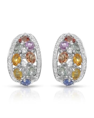 14KT White Gold 6.57ctw Multi Color Sapphire and Diamond Earrings. (16) Multi color sapphires with a total weight of 6.57cts. (100) Round Diamonds with a total weight of 0.85cts with a color of I and clarity of I-1. Total weight of these earrings are 9.91 grams.