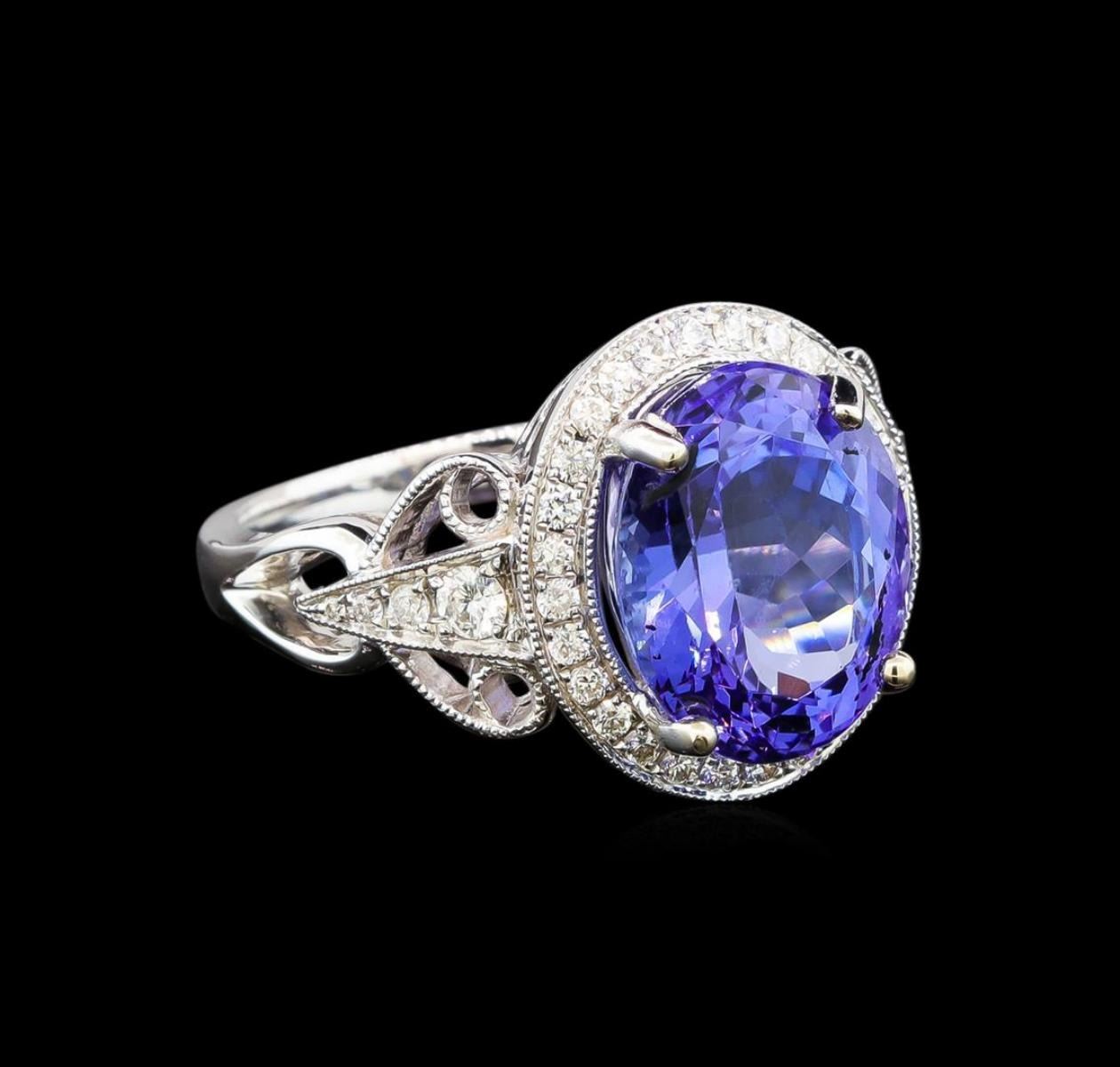 One electronically tested 14KT white gold ladies cast tanzanite and diamond ring with a bright polish finish. Identified with markings of "14K". Condition is new. Containing: One prong set oval modified brilliant cut natural tanzanite, measuring 12.80 x 10.60 x 6.90mm, approximate weight of 6.59ct., clarity is eye clean, type I, medium, moderately strong, violet color, (GIA V 5/4), cut is good. Two prong set round brilliant cut diamonds, measuring 2.40 - 2.40 x 1.44mm (depth est.) approximate total weight of 2 Stones = 0.10 ct. Clarity: SI-1 to SI-2. Color: I - J, Cut is Good. Thirty-Six prong set round brilliant cut diamonds, measuring 1.30 - 1.30 x 0.78mm (depth est.) approximate total weight of 36 Stones = 0.29ct. Clarity: SI-1 to SI-2. Color: I - J, Cut is Good. Colored gemstones are presumed to have been subjected to commonly used enhancement processes. All diamonds and colored gemstones are graded in the mounting, unless otherwise stated. Total Weight of Colored Stones 6.59ct. Total Weight of Diamonds 0.39ct. Total Weight of Ring 8.60 grams. GGL Appraised.