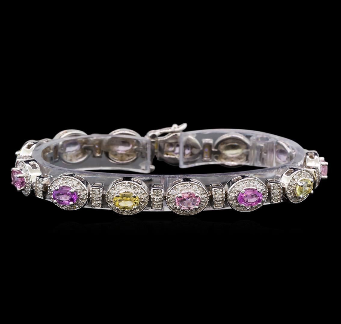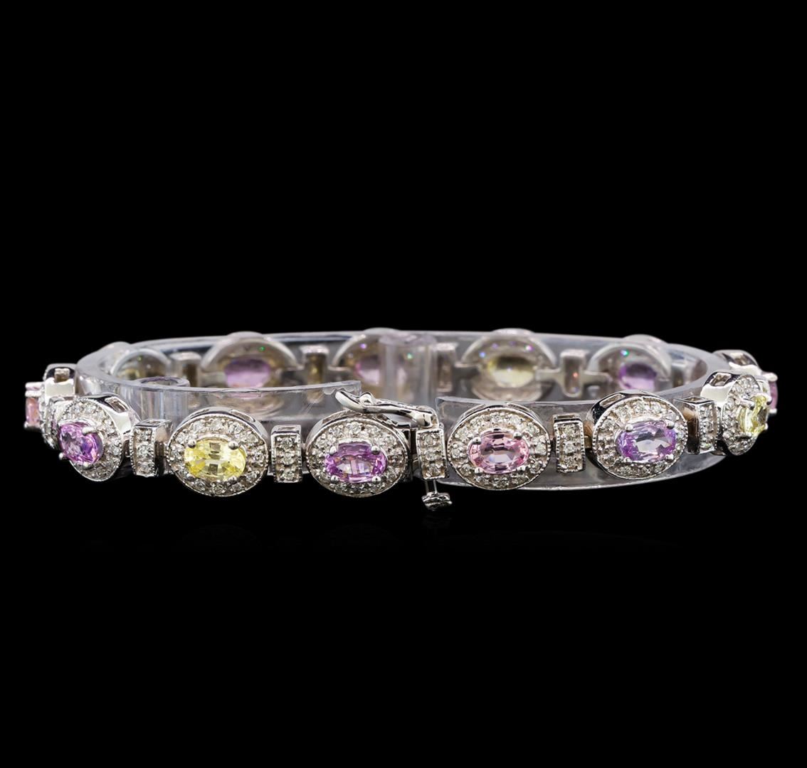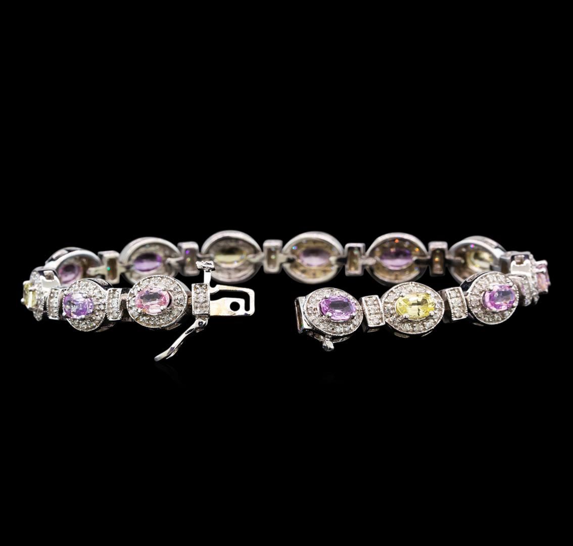 One electronically tested 14KT white gold ladies cast sapphire and diamond bracelet with a hidden box clasp with safety closer with a bright polish finish. Measurements: 7" in length. Identified with markings of "14K". Condition is new. Containing: Nine prong set oval modified brilliant cut natural purple sapphires, measuring 5.80 x 4.00. x 2.60mm, approximate total weight of 4.59ct., clarity is slightly included, type II, light, slightly grayish, purple color, (GIA P 3/2), cut is good. Four prong set oval modified brilliant cut natural yellow sapphires, measuring 6.00. x 4.00. x 2.60mm, approximate total weight of 2.08ct., clarity is slightly included, type II, light, brownish, yellow color, (GIA Y 3/3), cut is good. One Hundred Ninety-Five prong set round brilliant cut diamonds, measuring 1.20 - 1.20 x 0.72mm (depth est.) approximate total weight of 195 Stones = 1.23ct. Clarity: SI-2 to I-1. Color: I - J, Cut is Good. Colored gemstones are presumed to have been subjected to commonly used enhancement processes. All diamonds and colored gemstones are graded in the mounting, unless otherwise stated. Total Weight of Colored Stones 6.67ct. Total Weight of Diamonds 1.23ct. Total Weight of Bracelet 26.10 grams. GGL Appraised at $8,270.00.
