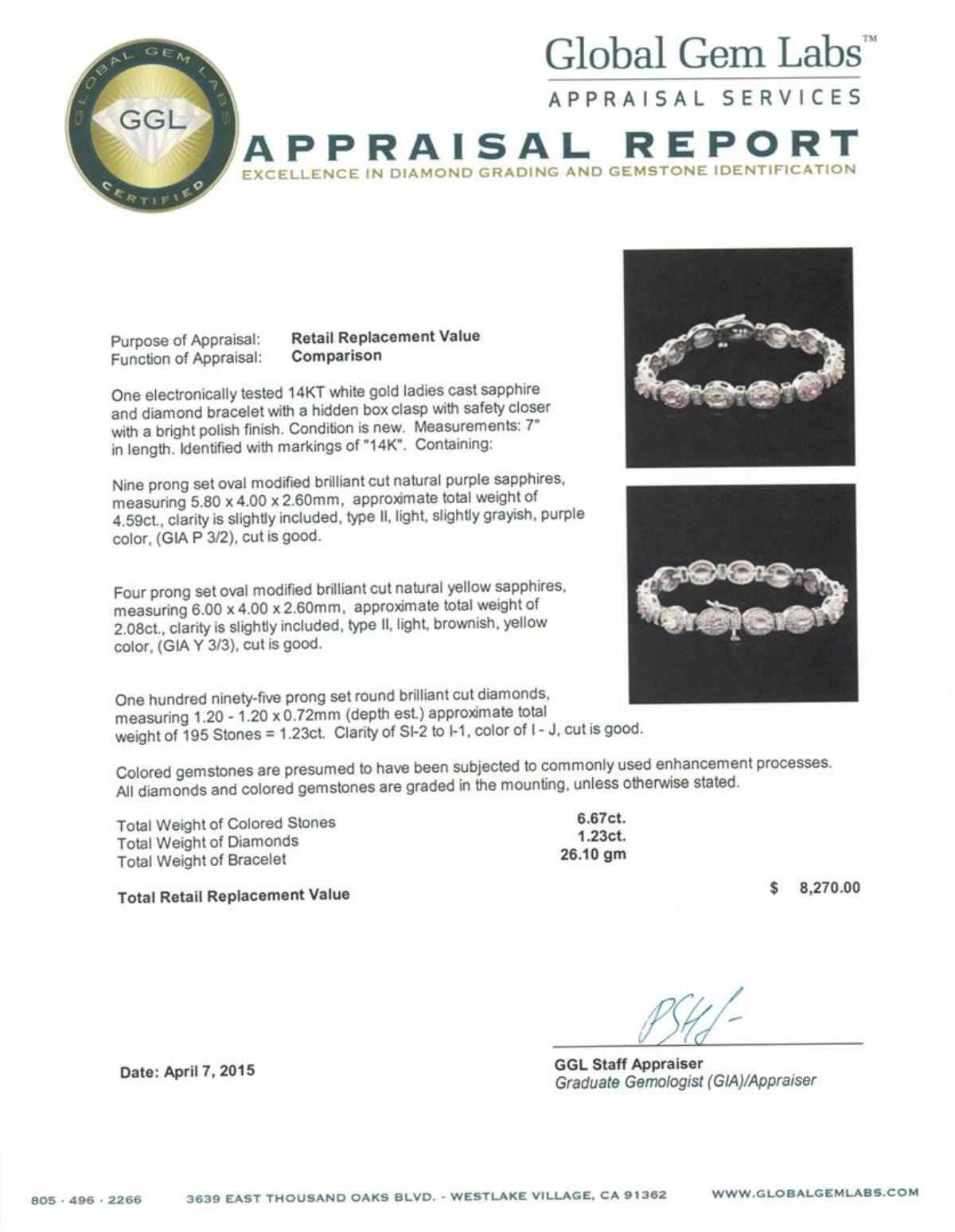 One electronically tested 14KT white gold ladies cast sapphire and diamond bracelet with a hidden box clasp with safety closer with a bright polish finish. Measurements: 7" in length. Identified with markings of "14K". Condition is new. Containing: Nine prong set oval modified brilliant cut natural purple sapphires, measuring 5.80 x 4.00. x 2.60mm, approximate total weight of 4.59ct., clarity is slightly included, type II, light, slightly grayish, purple color, (GIA P 3/2), cut is good. Four prong set oval modified brilliant cut natural yellow sapphires, measuring 6.00. x 4.00. x 2.60mm, approximate total weight of 2.08ct., clarity is slightly included, type II, light, brownish, yellow color, (GIA Y 3/3), cut is good. One Hundred Ninety-Five prong set round brilliant cut diamonds, measuring 1.20 - 1.20 x 0.72mm (depth est.) approximate total weight of 195 Stones = 1.23ct. Clarity: SI-2 to I-1. Color: I - J, Cut is Good. Colored gemstones are presumed to have been subjected to commonly used enhancement processes. All diamonds and colored gemstones are graded in the mounting, unless otherwise stated. Total Weight of Colored Stones 6.67ct. Total Weight of Diamonds 1.23ct. Total Weight of Bracelet 26.10 grams. GGL Appraised.