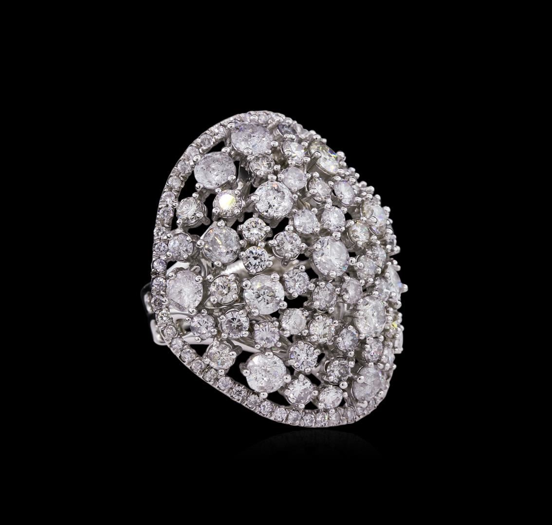 One electronically tested 14KT white gold Ladies combination cast & assembled ring with a bright polish finish. Condition is new. Identified with markings of "14K". Containing: Fifty-Seven prong set round brilliant cut diamonds, measuring 1.40 - 1.40 x 0.84mm (depth est.) approximate. Total Weight of 57 Stones = 0.57ct. Clarity: I-1 to I-2. Color: H - I, Cut is Good. Forty-Five prong set round brilliant cut diamonds, measuring 2.70 - 2.50 x 1.56mm (depth est.) approximate. Total Weight of 45 Stones = 2.89ct. Clarity: SI-2 to I-2. Color: I - J. Fourteen prong set round brilliant cut diamonds, measuring 4.00 - 4.00 x 2.40mm (depth est.) approximate. Total Weight of 14 Stones = 3.28ct. Clarity: I-1 to I-3. Color: I - K. Total Weight of Diamonds 6.74ct. Total Weight of Ring 19.10 grams. GGL Appraised at $20,535.00.