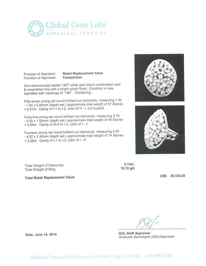 One electronically tested 14KT white gold Ladies combination cast & assembled ring with a bright polish finish. Condition is new. Identified with markings of "14K". Containing: Fifty-Seven prong set round brilliant cut diamonds, measuring 1.40 - 1.40 x 0.84mm (depth est.) approximate. Total Weight of 57 Stones = 0.57ct. Clarity: I-1 to I-2. Color: H - I, Cut is Good. Forty-Five prong set round brilliant cut diamonds, measuring 2.70 - 2.50 x 1.56mm (depth est.) approximate. Total Weight of 45 Stones = 2.89ct. Clarity: SI-2 to I-2. Color: I - J. Fourteen prong set round brilliant cut diamonds, measuring 4.00 - 4.00 x 2.40mm (depth est.) approximate. Total Weight of 14 Stones = 3.28ct. Clarity: I-1 to I-3. Color: I - K. Total Weight of Diamonds 6.74ct. Total Weight of Ring 19.10 grams. GGL Appraised.