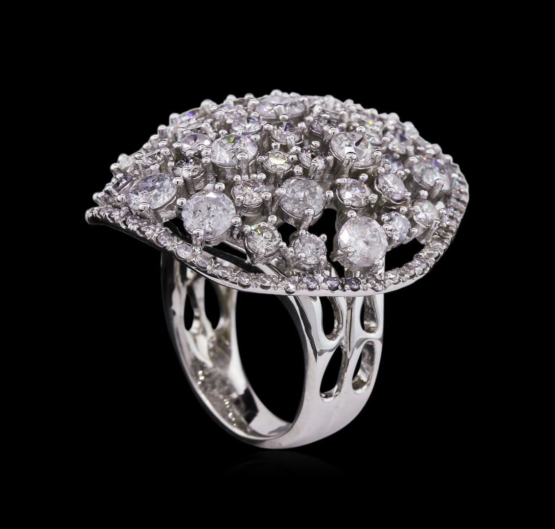 One electronically tested 14KT white gold Ladies combination cast & assembled ring with a bright polish finish. Condition is new. Identified with markings of "14K". Containing: Fifty-Seven prong set round brilliant cut diamonds, measuring 1.40 - 1.40 x 0.84mm (depth est.) approximate. Total Weight of 57 Stones = 0.57ct. Clarity: I-1 to I-2. Color: H - I, Cut is Good. Forty-Five prong set round brilliant cut diamonds, measuring 2.70 - 2.50 x 1.56mm (depth est.) approximate. Total Weight of 45 Stones = 2.89ct. Clarity: SI-2 to I-2. Color: I - J. Fourteen prong set round brilliant cut diamonds, measuring 4.00 - 4.00 x 2.40mm (depth est.) approximate. Total Weight of 14 Stones = 3.28ct. Clarity: I-1 to I-3. Color: I - K. Total Weight of Diamonds 6.74ct. Total Weight of Ring 19.10 grams. GGL Appraised.