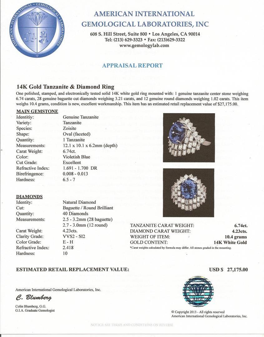 One polished, stamped, and electronically tested solid 14KT White Gold ring mounted with: 1 genuine tanzanite center stone weighing 6.74 carats, 28 genuine baguette cut diamonds weighing 3.21 carats, and 12 genuine round diamonds weighing 1.02 carats. This item weighs 10.4 grams, condition is new, excellent workmanship. AIGL Appraised at $27,175.00.