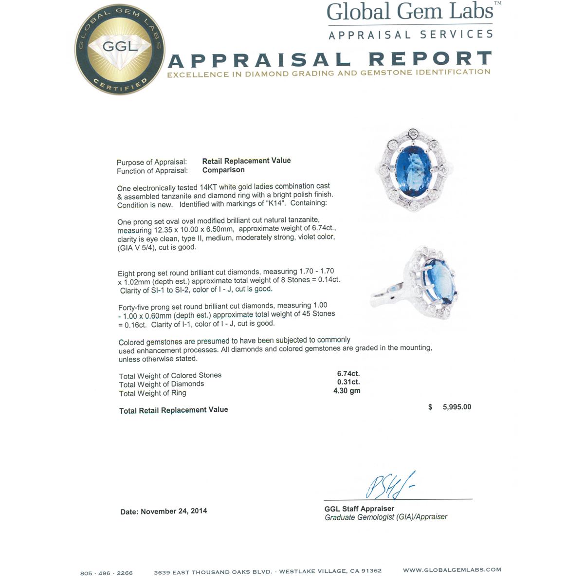 One electronically tested 14KT white gold ladies combination cast & assembled tanzanite and diamond ring with a bright polish finish. Identified with markings of "K14". Condition is new. Containing: One prong set oval oval modified brilliant cut natural tanzanite, measuring 12.35 x 10.00 x 6.50mm, approximate weight of 6.74ct., clarity is eye clean, type II, medium, moderately strong, violet color, (GIA V 5/4), cut is good. Eight prong set round brilliant cut diamonds, measuring 1.70 - 1.70 x 1.02mm (depth est.) approximate total weight of 8 Stones = 0.14ct. Clarity: SI-1 to SI-2. Color: I - J, Cut is Good. Forty-Five prong set round brilliant cut diamonds, measuring 1.00 - 1.00 x 0.60mm (depth est.) approximate total weight of 45 Stones = 0.16ct. Clarity: I-1. Color: I - J, Cut is Good. Colored gemstones are presumed to have been subjected to commonly used enhancement processes. All diamonds and colored gemstones are graded in the mounting, unless otherwise stated. Total Weight of Colored Stones 6.74ct. Total Weight of Diamonds 0.31ct. Total Weight of Ring 4.30 grams. GGL Appraised at $5,995.00.