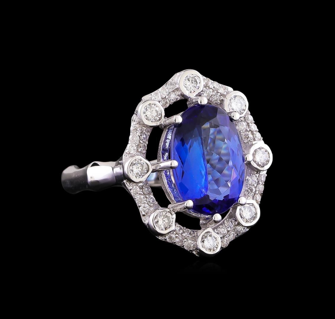 One electronically tested 14KT white gold ladies combination cast & assembled tanzanite and diamond ring with a bright polish finish. Identified with markings of "K14". Condition is new. Containing: One prong set oval oval modified brilliant cut natural tanzanite, measuring 12.35 x 10.00 x 6.50mm, approximate weight of 6.74ct., clarity is eye clean, type II, medium, moderately strong, violet color, (GIA V 5/4), cut is good. Eight prong set round brilliant cut diamonds, measuring 1.70 - 1.70 x 1.02mm (depth est.) approximate total weight of 8 Stones = 0.14ct. Clarity: SI-1 to SI-2. Color: I - J, Cut is Good. Forty-Five prong set round brilliant cut diamonds, measuring 1.00 - 1.00 x 0.60mm (depth est.) approximate total weight of 45 Stones = 0.16ct. Clarity: I-1. Color: I - J, Cut is Good. Colored gemstones are presumed to have been subjected to commonly used enhancement processes. All diamonds and colored gemstones are graded in the mounting, unless otherwise stated. Total Weight of Colored Stones 6.74ct. Total Weight of Diamonds 0.31ct. Total Weight of Ring 4.30 grams. GGL Appraised at $5,995.00.