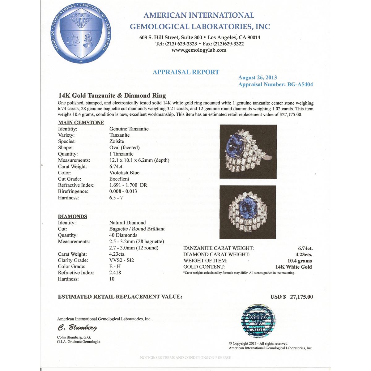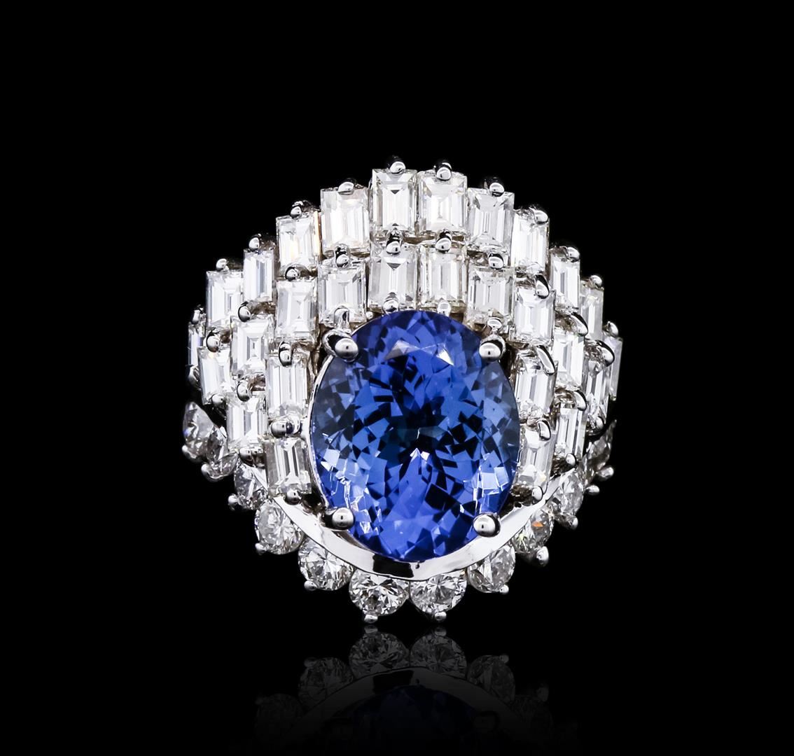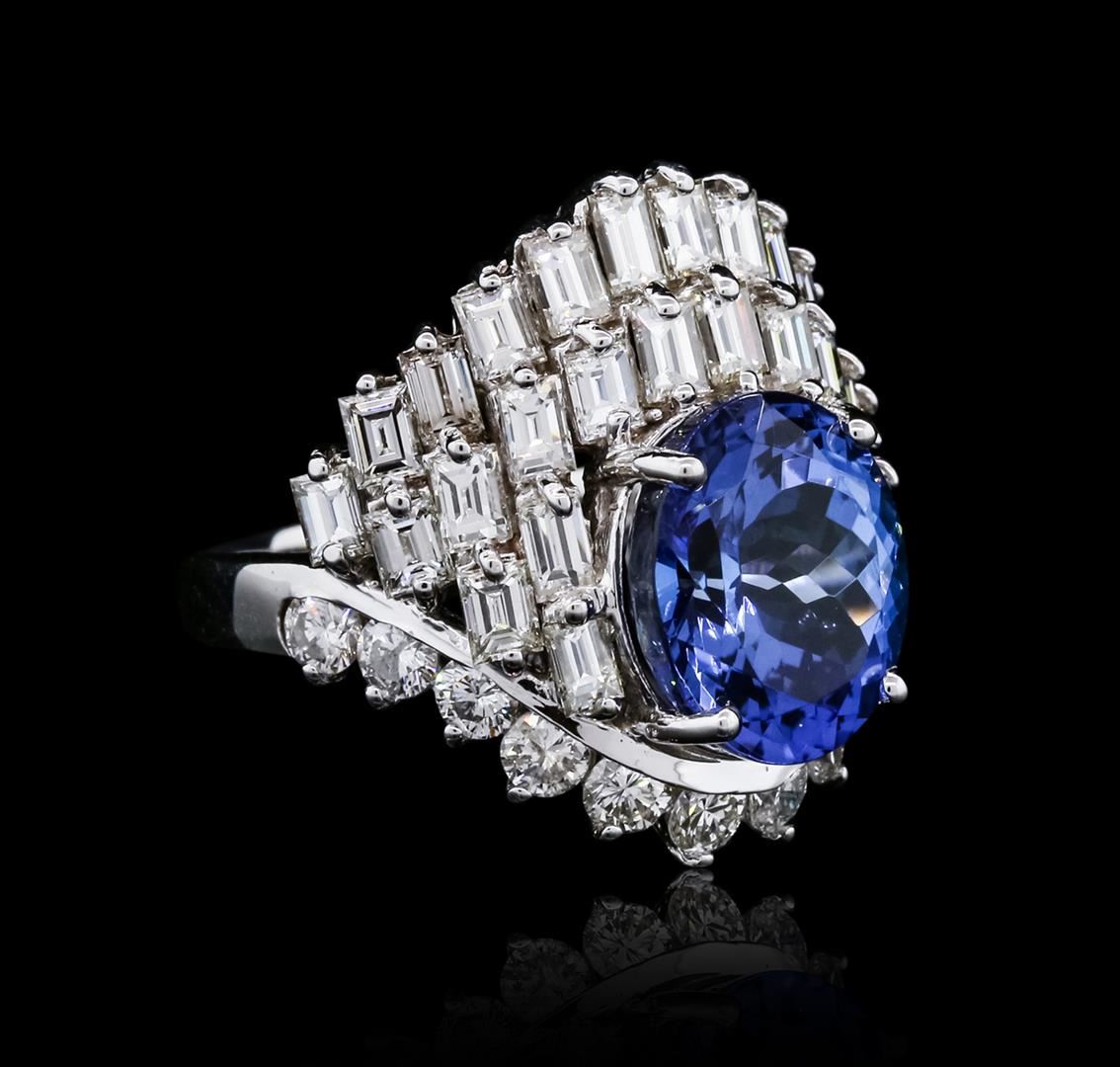 One polished, stamped, and electronically tested solid 14KT White Gold ring mounted with: 1 genuine tanzanite center stone weighing 6.74 carats, 28 genuine baguette cut diamonds weighing 3.21 carats, and 12 genuine round diamonds weighing 1.02 carats. This item weighs 10.4 grams, condition is new, excellent workmanship. AIGL Appraised at $27,175.00.