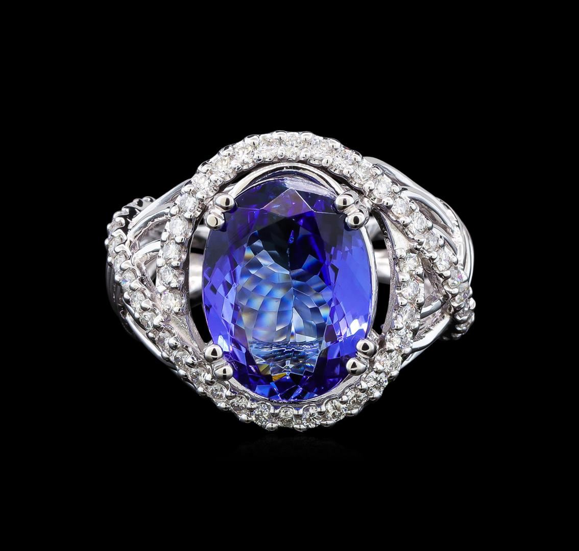 One electronically tested 14KT white gold ladies cast tanzanite and diamond ring with a bright polish finish. Identified with markings of "14K". Condition is new. Containing: One prong set oval oval modified brilliant cut natural tanzanite, measuring 14.80 x 11.10 x 5.86mm, approximate weight of 6.77ct., clarity is eye clean, type I, medium light, very slightly grayish, violet color, (GIA V 4/3), cut is good. Fifty prong set round brilliant cut diamonds, measuring 1.50 - 1.50 x 0.90mm (depth est.) approximate total weight of 50 Stones = 0.62ct. Clarity: SI-1 to I-1. Color: I - J, Cut is Good. Colored gemstones are presumed to have been subjected to commonly used enhancement processes. All diamonds and colored gemstones are graded in the mounting, unless otherwise stated. Total Weight of Colored Stones 6.77ct. Total Weight of Diamonds 0.62ct. Total Weight of Ring 10.70 grams. GGL Appraised at $7,035.00.