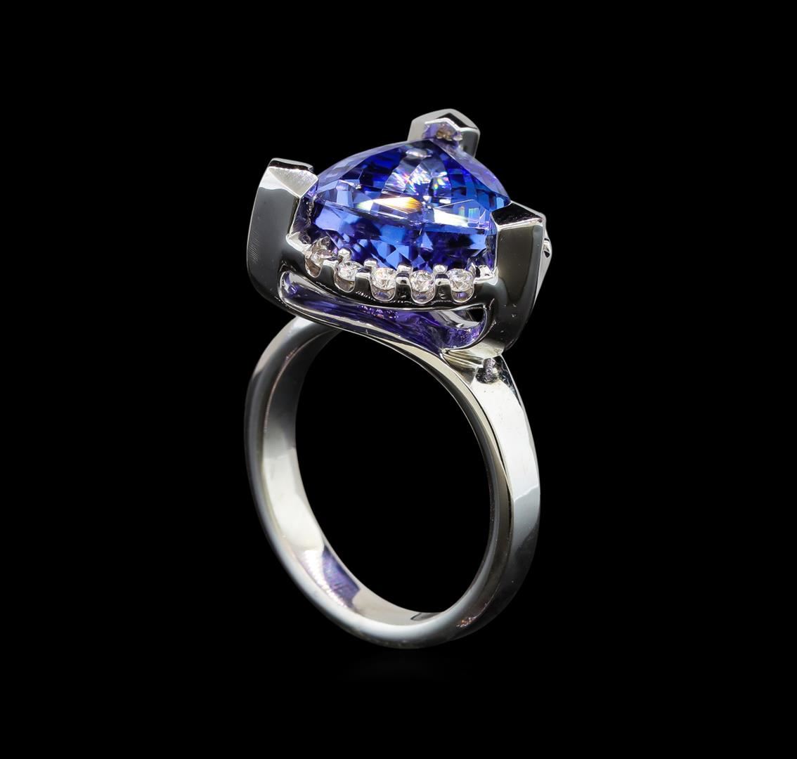 One electronically tested 14KT white gold ladies cast tanzanite and diamond ring with a bright polish finish. Identified with markings of "14K". Condition is new. Containing: One prong set triangle modified brilliant cut natural tanzanite, measuring 12.00 x 12.00 x 7.81mm, approximate weight of 6.78ct., clarity is eye clean, type I, medium light, moderately strong, violet color, (GIA V 4/4), cut is good. Fifteen prong set round brilliant cut diamonds, measuring 1.50 - 1.50 x 0.90mm (depth est.) approximate total weight of 15 Stones = 0.19ct. Clarity: SI-1 to SI-2. Color: H - I, Cut is Good. Colored gemstones are presumed to have been subjected to commonly used enhancement processes. All diamonds and colored gemstones are graded in the mounting, unless otherwise stated. Total Weight of Colored Stones 6.78ct. Total Weight of Diamonds 0.19ct. Total Weight of Ring 9.80 grams. GGL Appraised at $6,380.00.