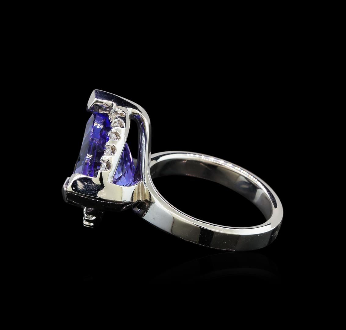 One electronically tested 14KT white gold ladies cast tanzanite and diamond ring with a bright polish finish. Identified with markings of "14K". Condition is new. Containing: One prong set triangle modified brilliant cut natural tanzanite, measuring 12.00 x 12.00 x 7.81mm, approximate weight of 6.78ct., clarity is eye clean, type I, medium light, moderately strong, violet color, (GIA V 4/4), cut is good. Fifteen prong set round brilliant cut diamonds, measuring 1.50 - 1.50 x 0.90mm (depth est.) approximate total weight of 15 Stones = 0.19ct. Clarity: SI-1 to SI-2. Color: H - I, Cut is Good. Colored gemstones are presumed to have been subjected to commonly used enhancement processes. All diamonds and colored gemstones are graded in the mounting, unless otherwise stated. Total Weight of Colored Stones 6.78ct. Total Weight of Diamonds 0.19ct. Total Weight of Ring 9.80 grams. GGL Appraised at $6,380.00.