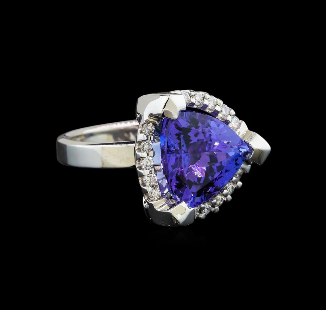 One electronically tested 14KT white gold ladies cast tanzanite and diamond ring with a bright polish finish. Identified with markings of "14K". Condition is new. Containing: One prong set triangle modified brilliant cut natural tanzanite, measuring 12.00 x 12.00 x 7.81mm, approximate weight of 6.78ct., clarity is eye clean, type I, medium light, moderately strong, violet color, (GIA V 4/4), cut is good. Fifteen prong set round brilliant cut diamonds, measuring 1.50 - 1.50 x 0.90mm (depth est.) approximate total weight of 15 Stones = 0.19ct. Clarity: SI-1 to SI-2. Color: H - I, Cut is Good. Colored gemstones are presumed to have been subjected to commonly used enhancement processes. All diamonds and colored gemstones are graded in the mounting, unless otherwise stated. Total Weight of Colored Stones 6.78ct. Total Weight of Diamonds 0.19ct. Total Weight of Ring 9.80 grams. GGL Appraised at $6,380.00.