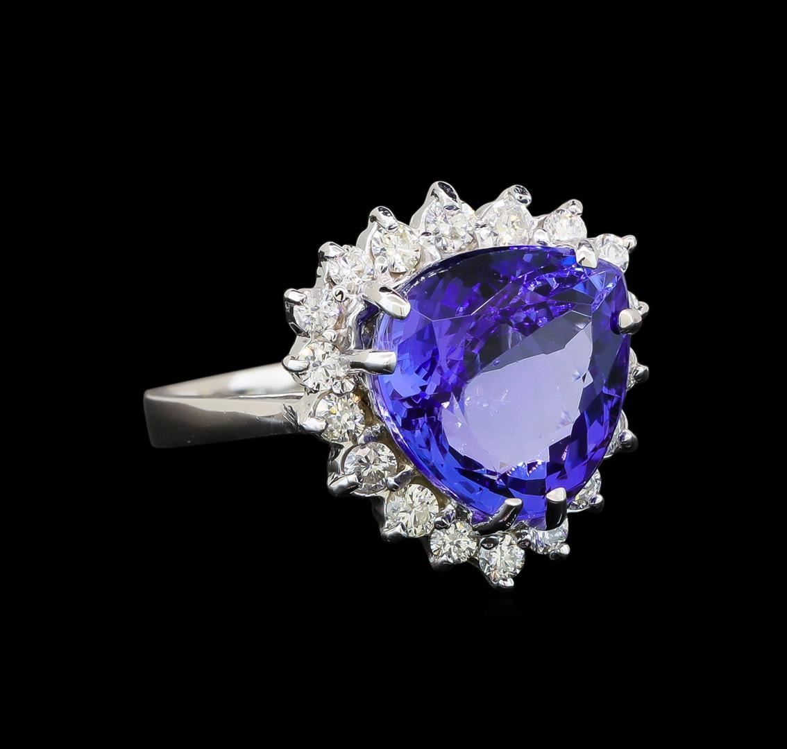 One electronically tested 14KT white gold ladies cast tanzanite and diamond ring with a bright polish finish. Identified with markings of "14K". Condition is new. Containing: One prong set triangle modified brilliant cut natural tanzanite, measuring 12.00. x 12.00. x 7.81mm, approximate weight of 6.78ct., clarity is eye clean, type I, medium light, very slightly grayish, bluish violet color, (GIA bV 4/3), cut is good. Twenty prong set round brilliant cut diamonds, measuring 2.00. - 2.00. x 1.20mm (depth est.) approximate total weight of 20 Stones = 0.58ct. Clarity: SI-1 to SI-2. Color: I - J. All diamonds and colored gemstones are graded in the mounting, unless otherwise stated. Colored gemstones are presumed to have been subjected to commonly used enhancement processes. Total Weight of Colored Stones 6.78ct. Total Weight of Diamonds 0.58ct. Total Weight of Ring 5.00. grams. GGL Appraised.