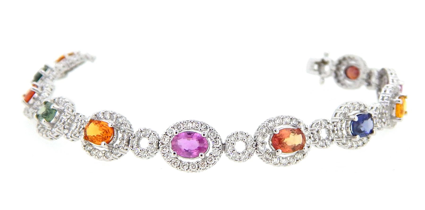 One 14KT White Gold 6.80ctw Multi Color Sapphire and Diamond Bracelet. (11) Multi color Sapphires with a total weight of 6.80cts. (253) Diamonds with a total weight of 3.33cts with a color of F-G and clarity of VS-2 to SI-1. Total weight of this bracelet is 15.0 grams.