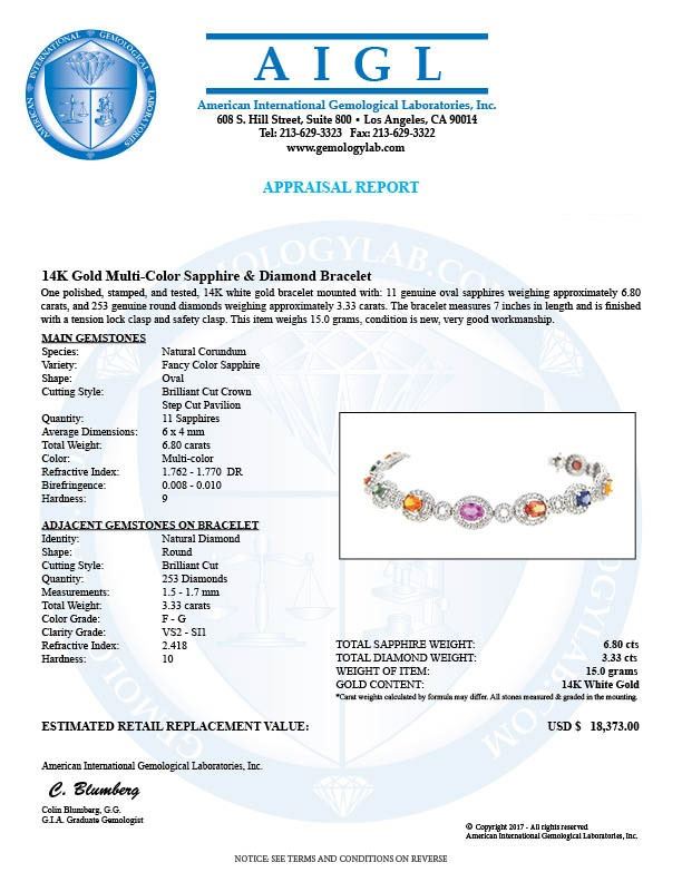 One 14KT White Gold 6.80ctw Multi Color Sapphire and Diamond Bracelet. (11) Multi color Sapphires with a total weight of 6.80cts. (253) Diamonds with a total weight of 3.33cts with a color of F-G and clarity of VS-2 to SI-1. Total weight of this bracelet is 15.0 grams.