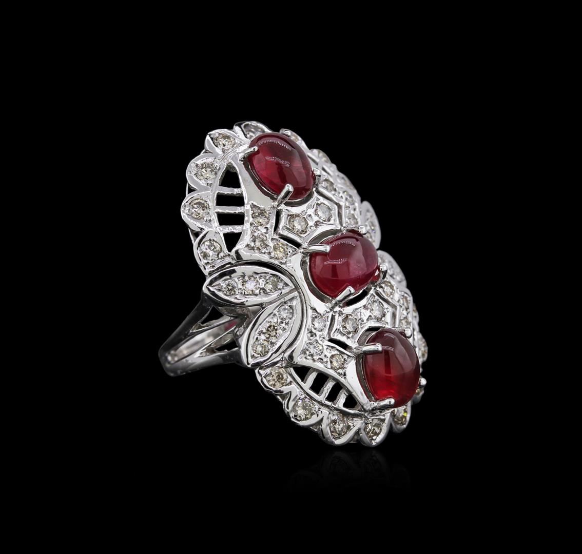 One electronically tested 14KT white gold ladies cast ruby and diamond ring with a bright polish finish. Identified with markings of "14K". Condition is new. Containing: Three prong set oval cabochon cut natural rubies, measuring 8.30 x 6.20 x 4.03mm, approximate total weight of 6.81ct., clarity is heavily included, medium, very slightly brownish, strongly purplish red color, (GIA stpR 5/3), cut is good. Forty-Four prong set round brilliant cut diamonds, measuring 2.00 - 2.00 x 1.20mm (depth est.) approximate total weight of 44 Stones = 1.29ct. Clarity: SI-1 to I-1. Color: L - M, Cut is Good. Diamonds and colored gemstones are graded in the mounting, unless otherwise stated. Colored gemstones are presumed to have been subjected to commonly used enhancement processes. Total Weight of Colored Stones 6.81ct. Total Weight of Diamonds 1.29ct. Total Weight of Ring 13.50 grams. GGL Appraised at $4,605.00.