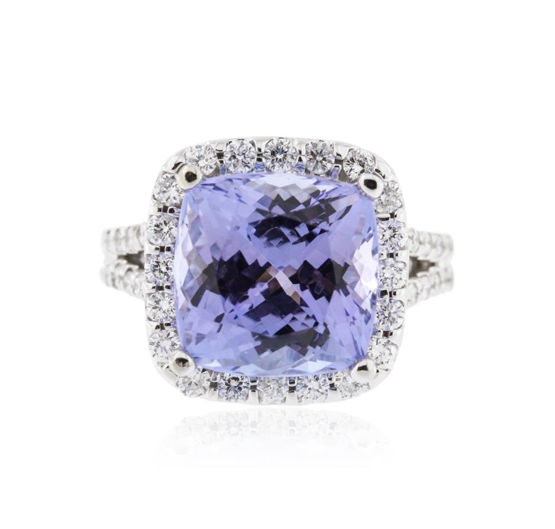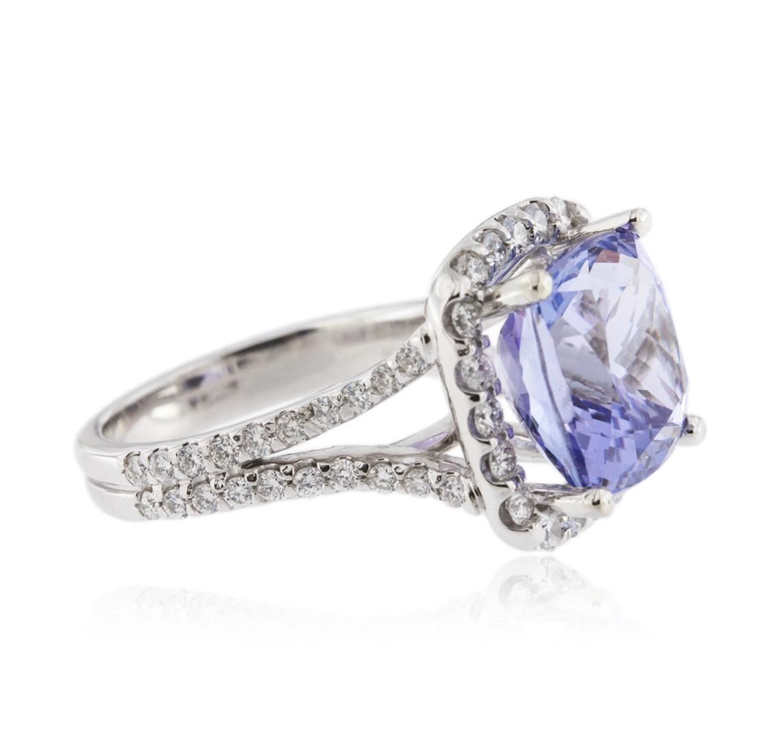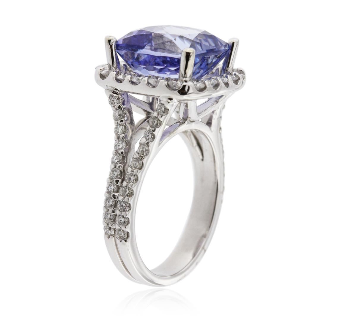 One electronically tested 14KT white gold ladies cast tanzanite and diamond ring with a bright polish finish. Identified with markings of "K14". Condition is new. Containing: One prong set square cushion modified brilliant cut natural tanzanite, measuring 11.00 x 11.00 x 7.15mm, approximate weight of 6.81ct., clarity is eye clean, type I, medium light, moderately strong, violet color, (GIA V 4/4), cut is good. Sixty prong set round brilliant cut diamonds, measuring 1.30 - 1.30 x 0.78mm (depth est.) approximate. Total Weight of 60 Stones = 0.48ct. Clarity: SI-1 to SI-2. Color: I - J, Cut is Good. Colored gemstones are presumed to have been subjected to commonly used enhancement processes. All diamonds and colored gemstones are graded in the mounting, unless otherwise stated. Total Weight of Colored Stones 6.81ct. Total Weight of Diamonds 0.48ct. Total Weight of Ring 8.00 grams. GGL Appraised at $4,610.00.