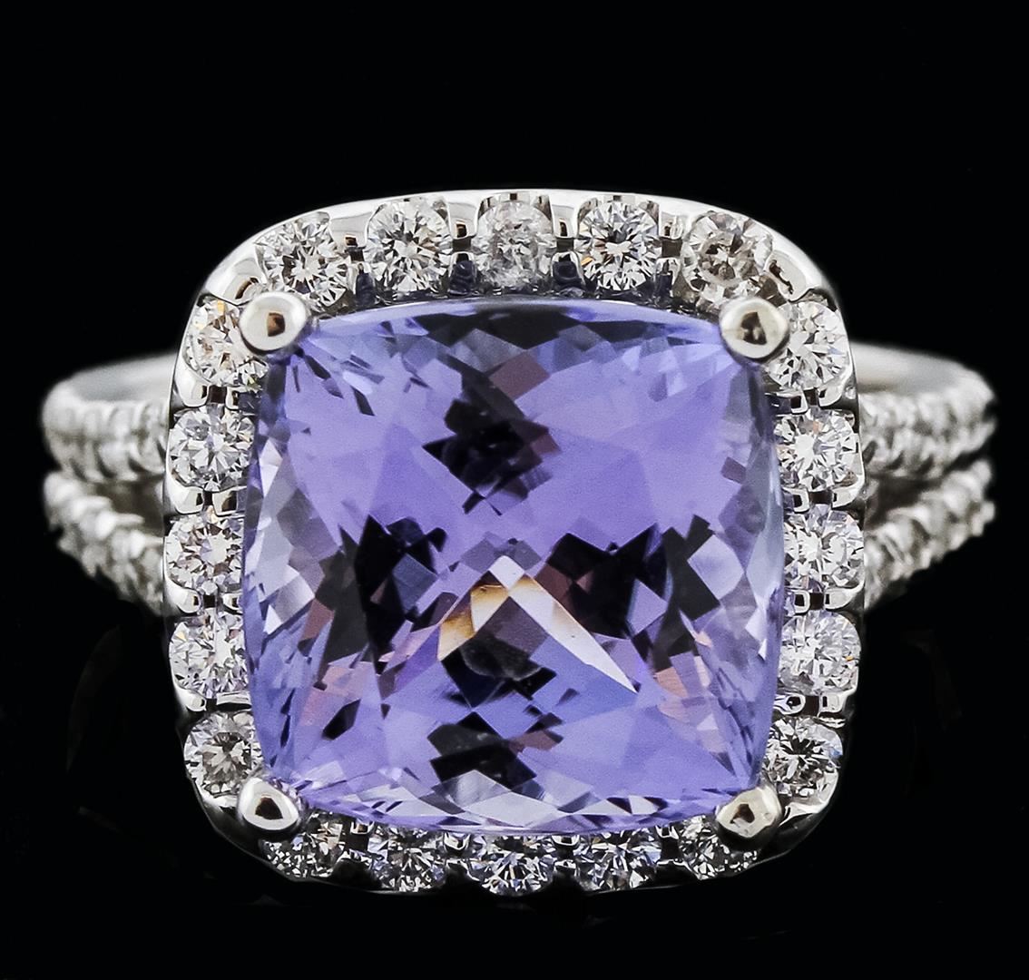 One electronically tested 14KT white gold ladies cast tanzanite and diamond ring with a bright polish finish. Identified with markings of "K14". Condition is new. Containing: One prong set square cushion modified brilliant cut natural tanzanite, measuring 11.00 x 11.00 x 7.15mm, approximate weight of 6.81ct., clarity is eye clean, type I, medium light, moderately strong, violet color, (GIA V 4/4), cut is good. Sixty prong set round brilliant cut diamonds, measuring 1.30 - 1.30 x 0.78mm (depth est.) approximate. Total Weight of 60 Stones = 0.48ct. Clarity: SI-1 to SI-2. Color: I - J, Cut is Good. Colored gemstones are presumed to have been subjected to commonly used enhancement processes. All diamonds and colored gemstones are graded in the mounting, unless otherwise stated. Total Weight of Colored Stones 6.81ct. Total Weight of Diamonds 0.48ct. Total Weight of Ring 8.00 grams. GGL Appraised at $4,610.00.