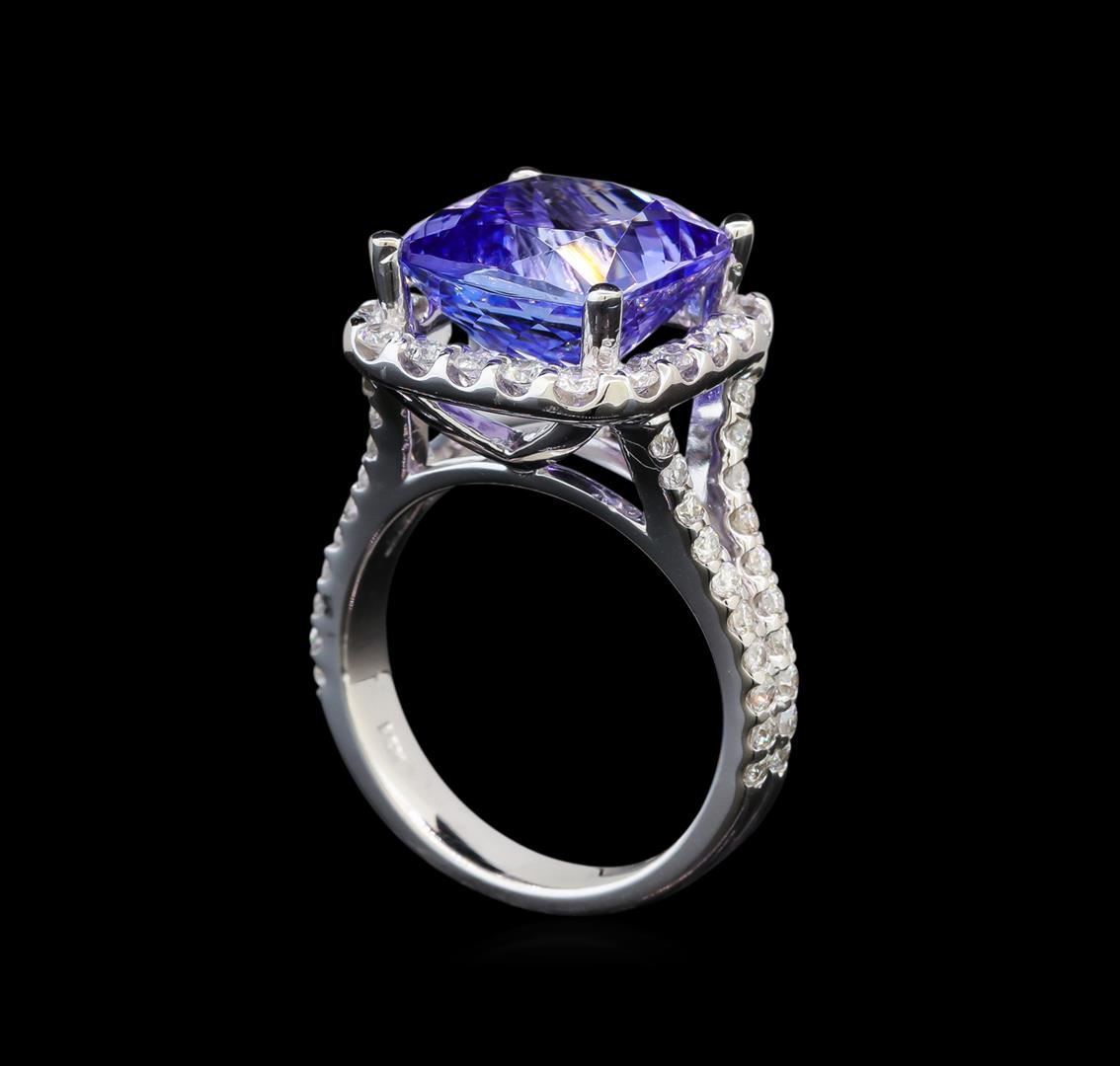 One electronically tested 14KT white gold ladies cast tanzanite and diamond ring with a bright polish finish. Identified with markings of "K14". Condition is new. Containing: One prong set square cushion modified brilliant cut natural tanzanite, measuring 11.00 x 11.00 x 7.15mm, approximate weight of 6.81ct., clarity is eye clean, type I, medium light, moderately strong, violet color, (GIA V 4/4), cut is good. Sixty prong set round brilliant cut diamonds, measuring 1.30 - 1.30 x 0.78mm (depth est.) approximate. Total Weight of 60 Stones = 0.48ct. Clarity: SI-1 to SI-2. Color: I - J, Cut is Good. Colored gemstones are presumed to have been subjected to commonly used enhancement processes. All diamonds and colored gemstones are graded in the mounting, unless otherwise stated. Total Weight of Colored Stones 6.81ct. Total Weight of Diamonds 0.48ct. Total Weight of Ring 8.00 grams. GGL Appraised at $4,610.00.