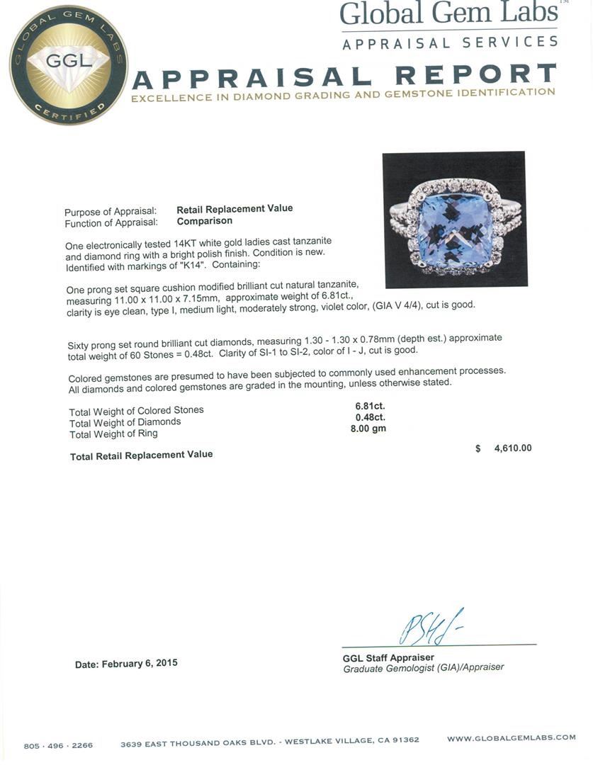 One electronically tested 14KT white gold ladies cast tanzanite and diamond ring with a bright polish finish. Identified with markings of "K14". Condition is new. Containing: One prong set square cushion modified brilliant cut natural tanzanite, measuring 11.00 x 11.00 x 7.15mm, approximate weight of 6.81ct., clarity is eye clean, type I, medium light, moderately strong, violet color, (GIA V 4/4), cut is good. Sixty prong set round brilliant cut diamonds, measuring 1.30 - 1.30 x 0.78mm (depth est.) approximate. Total Weight of 60 Stones = 0.48ct. Clarity: SI-1 to SI-2. Color: I - J, Cut is Good. Colored gemstones are presumed to have been subjected to commonly used enhancement processes. All diamonds and colored gemstones are graded in the mounting, unless otherwise stated. Total Weight of Colored Stones 6.81ct. Total Weight of Diamonds 0.48ct. Total Weight of Ring 8.00 grams. GGL Appraised.
