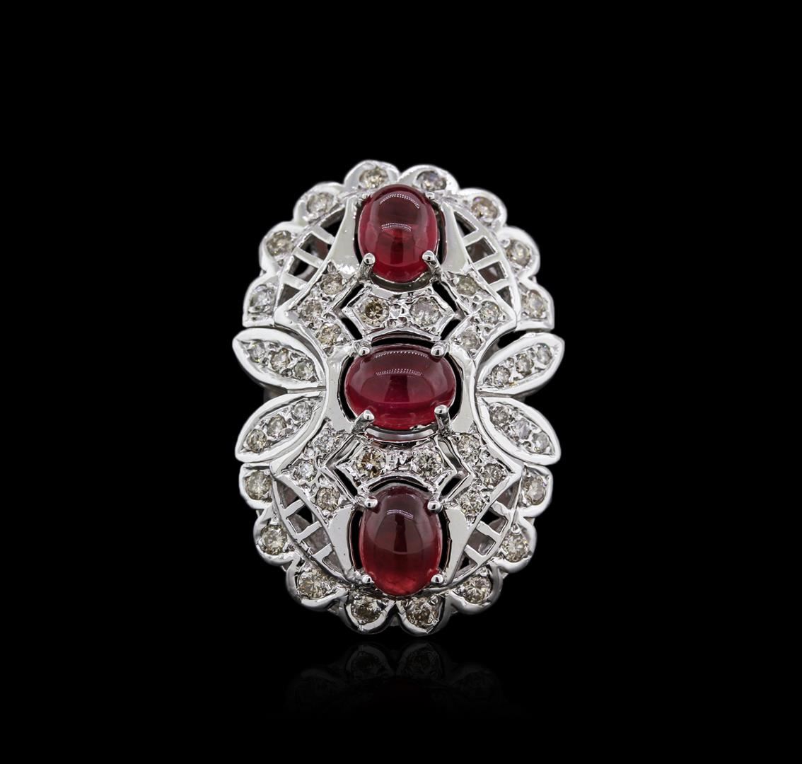 One electronically tested 14KT white gold ladies cast ruby and diamond ring with a bright polish finish. Identified with markings of "14K". Condition is new. Containing: Three prong set oval cabochon cut natural rubies, measuring 8.30 x 6.20 x 4.03mm, approximate total weight of 6.81ct., clarity is heavily included, medium, very slightly brownish, strongly purplish red color, (GIA stpR 5/3), cut is good. Forty-Four prong set round brilliant cut diamonds, measuring 2.00 - 2.00 x 1.20mm (depth est.) approximate total weight of 44 Stones = 1.29ct. Clarity: SI-1 to I-1. Color: L - M, Cut is Good. Diamonds and colored gemstones are graded in the mounting, unless otherwise stated. Colored gemstones are presumed to have been subjected to commonly used enhancement processes. Total Weight of Colored Stones 6.81ct. Total Weight of Diamonds 1.29ct. Total Weight of Ring 13.50 grams. GGL Appraised at $4,605.00.
