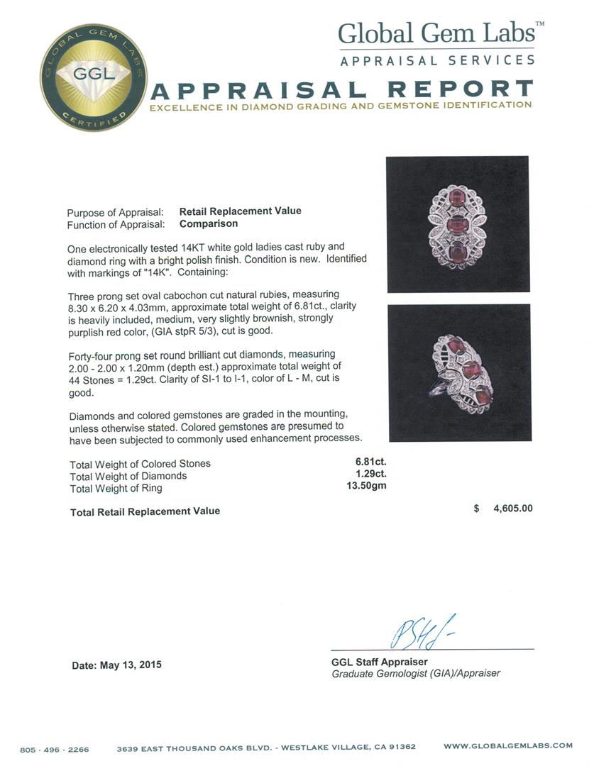 One electronically tested 14KT white gold ladies cast ruby and diamond ring with a bright polish finish. Identified with markings of "14K". Condition is new. Containing: Three prong set oval cabochon cut natural rubies, measuring 8.30 x 6.20 x 4.03mm, approximate total weight of 6.81ct., clarity is heavily included, medium, very slightly brownish, strongly purplish red color, (GIA stpR 5/3), cut is good. Forty-Four prong set round brilliant cut diamonds, measuring 2.00 - 2.00 x 1.20mm (depth est.) approximate total weight of 44 Stones = 1.29ct. Clarity: SI-1 to I-1. Color: L - M, Cut is Good. Diamonds and colored gemstones are graded in the mounting, unless otherwise stated. Colored gemstones are presumed to have been subjected to commonly used enhancement processes. Total Weight of Colored Stones 6.81ct. Total Weight of Diamonds 1.29ct. Total Weight of Ring 13.50 grams. GGL Appraised at $4,605.00.