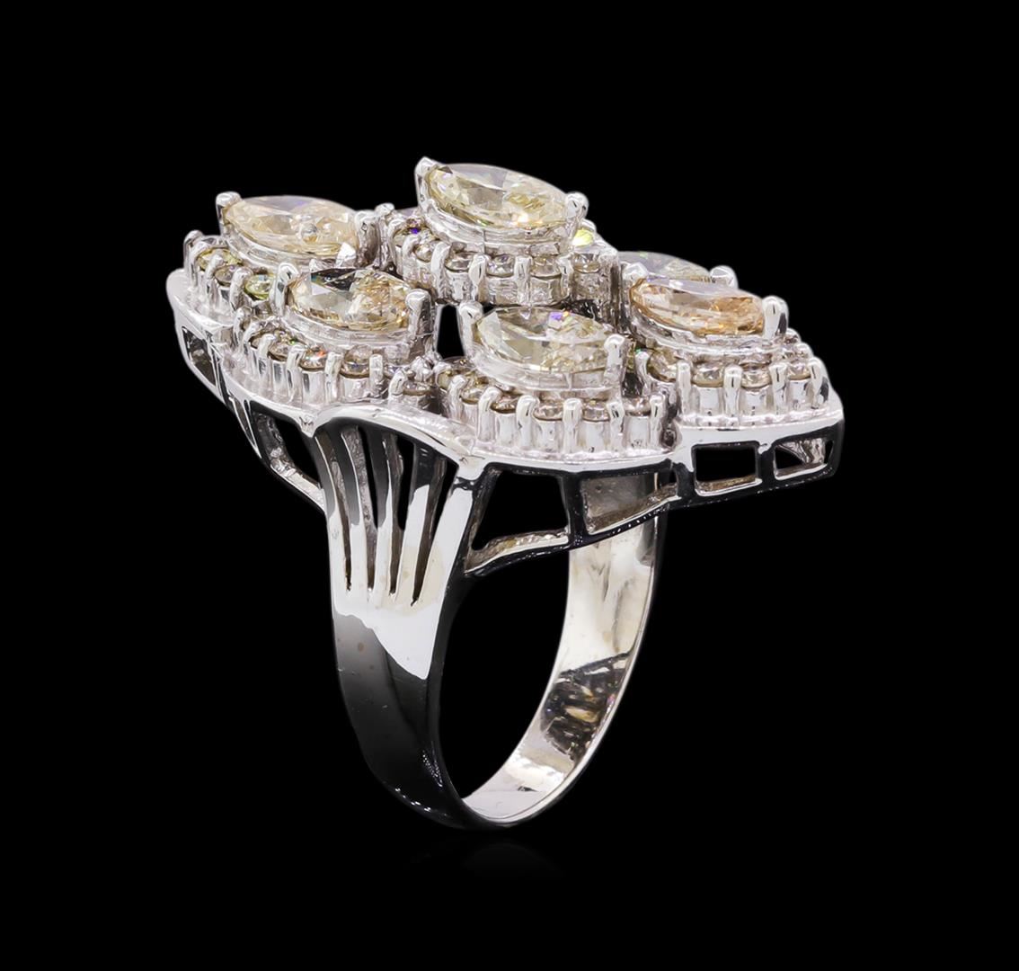 New Condition! One suite electronically tested 14KT white gold Ladies combination cast & assembled fashion ring and earrings with screw backs with a bright polish finish. Identified with markings of "14K". Condition is excellent. Containing: Eighty-Five prong set round brilliant cut diamonds, measuring 1.50 - 1.50 x 0.90mm (depth est.) approximate total weight of 85 Stones = 1.04ct. Clarity of SI-1 to I-1, Color of J - N. Nine prong set marquise shaped cut diamonds, measuring 8.57 x 4.52 x 2.89mm (depth est.) approximate total weight of 9 Stones = 5.78ct. Clarity of I-1 to I-1, Color of N - P. Total Weight of Diamonds 6.82 ct. Total Weight of Ring 13.50 gm. GGL Appraised at $33,125.00.