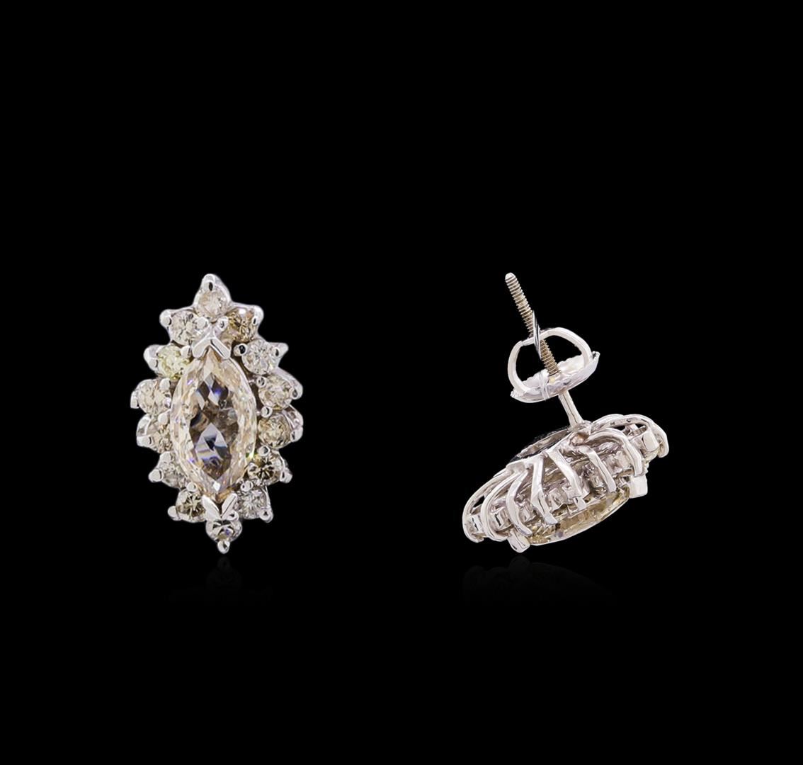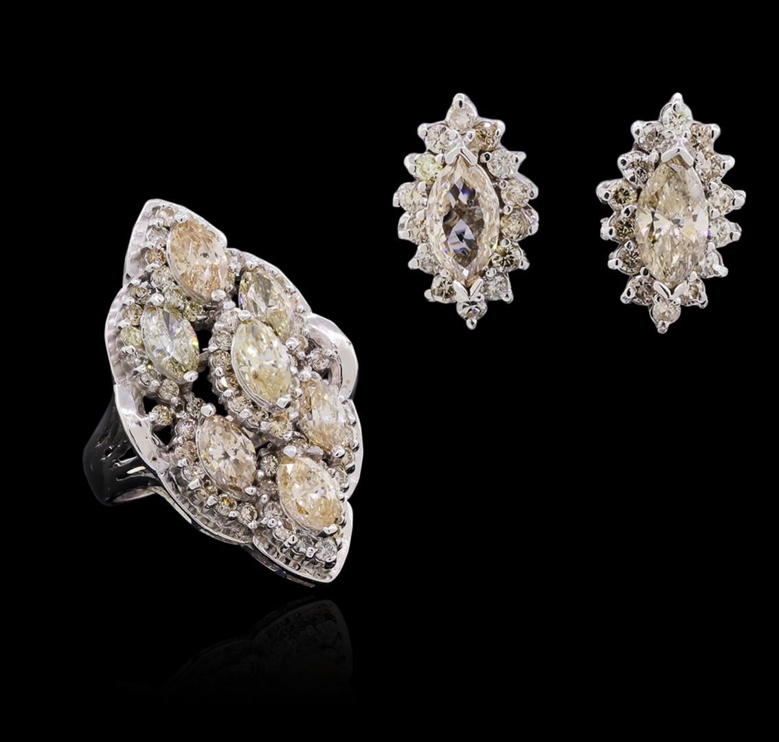 New Condition! One suite electronically tested 14KT white gold Ladies combination cast & assembled fashion ring and earrings with screw backs with a bright polish finish. Identified with markings of "14K". Condition is excellent. Containing: Eighty-Five prong set round brilliant cut diamonds, measuring 1.50 - 1.50 x 0.90mm (depth est.) approximate total weight of 85 Stones = 1.04ct. Clarity of SI-1 to I-1, Color of J - N. Nine prong set marquise shaped cut diamonds, measuring 8.57 x 4.52 x 2.89mm (depth est.) approximate total weight of 9 Stones = 5.78ct. Clarity of I-1 to I-1, Color of N - P. Total Weight of Diamonds 6.82 ct. Total Weight of Ring 13.50 gm. GGL Appraised at $33,125.00.