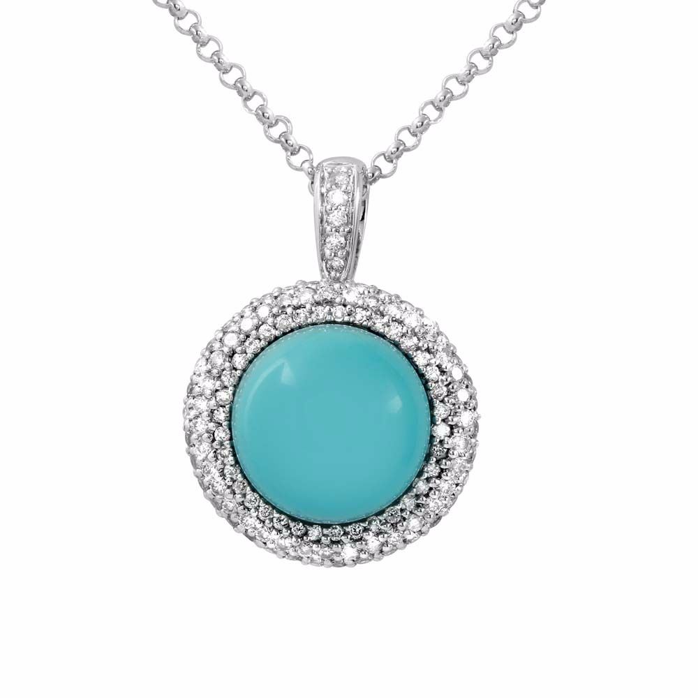 One 14KT White Gold 6.84ct Turquoise and Diamond Pendant with Chain. (1) Turquoise stone with a total weight of 6.84cts. (149) Round Diamonds with a total weight of 2.47cts. Total weight of this pendant with chain is 10.95 grams. Total weight of this pendant with chain is 10.95 grams.