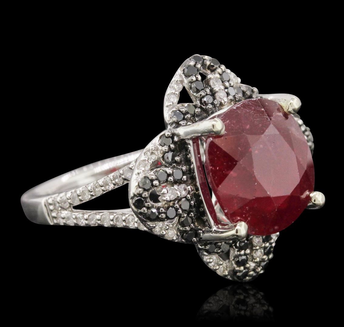 One electronically tested 14KT white gold ladies combination cast & assembled ring with a bright polish finish. Condition is new. Identified with markings of "14K". Containing: One prong set oval modified brilliant cut natural ruby, measuring 11.10 x 10.60 x 7.30mm, approximate weight of 6.87ct., clarity is heavily included, type II, medium dark, moderately strong, strongly purplish red color, (GIA stpR 6/4), cut is good. Fifty-Six prong set round brilliant cut diamonds, measuring 1.30 - 1.30 x 0.78mm (depth est.) approximate total weight of 56 Stones = 0.45ct. Clarity: I-1 to I-2. Color: I - J, Cut is Good. Forty-Four prong set round brilliant cut diamonds, measuring 1.30 - 1.30 x 0.00mm (depth est.) approximate total weight of 44 Stones = 0.00ct. Cut is Good. Colored gemstones are presumed to have been subjected to commonly used enhancement processes. All diamonds and colored gemstones are graded in the mounting, unless otherwise stated. Total Weight of Colored Stones 6.87ct. Total Weight of Diamonds 0.45ct. Total Weight of Ring 6.80 grams. GGL Appraised at $5,415.00.