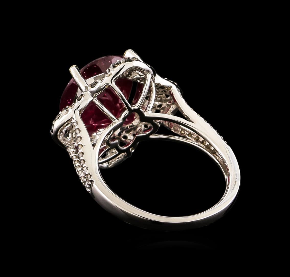 One electronically tested 14KT white gold ladies combination cast & assembled ring with a bright polish finish. Condition is new. Identified with markings of "14K". Containing: One prong set oval modified brilliant cut natural ruby, measuring 11.10 x 10.60 x 7.30mm, approximate weight of 6.87ct., clarity is heavily included, type II, medium dark, moderately strong, strongly purplish red color, (GIA stpR 6/4), cut is good. Fifty-Six prong set round brilliant cut diamonds, measuring 1.30 - 1.30 x 0.78mm (depth est.) approximate total weight of 56 Stones = 0.45ct. Clarity: I-1 to I-2. Color: I - J, Cut is Good. Forty-Four prong set round brilliant cut diamonds, measuring 1.30 - 1.30 x 0.00mm (depth est.) approximate total weight of 44 Stones = 0.00ct. Cut is Good. Colored gemstones are presumed to have been subjected to commonly used enhancement processes. All diamonds and colored gemstones are graded in the mounting, unless otherwise stated. Total Weight of Colored Stones 6.87ct. Total Weight of Diamonds 0.45ct. Total Weight of Ring 6.80 grams. GGL Appraised at $5,415.00.