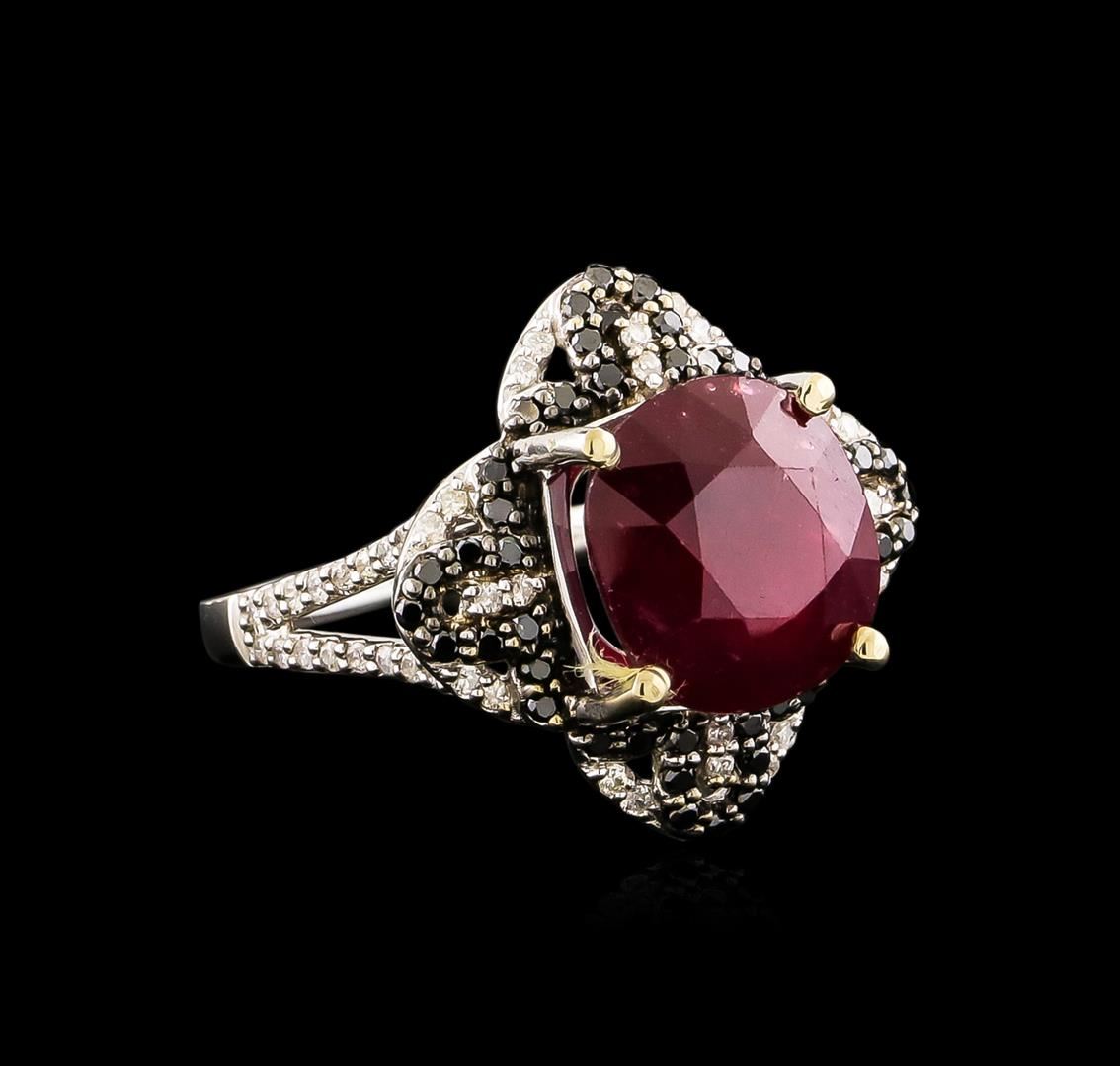 One electronically tested 14KT white gold ladies combination cast & assembled ring with a bright polish finish. Condition is new. Identified with markings of "14K". Containing: One prong set oval modified brilliant cut natural ruby, measuring 11.10 x 10.60 x 7.30mm, approximate weight of 6.87ct., clarity is heavily included, type II, medium dark, moderately strong, strongly purplish red color, (GIA stpR 6/4), cut is good. Fifty-Six prong set round brilliant cut diamonds, measuring 1.30 - 1.30 x 0.78mm (depth est.) approximate total weight of 56 Stones = 0.45ct. Clarity: I-1 to I-2. Color: I - J, Cut is Good. Forty-Four prong set round brilliant cut diamonds, measuring 1.30 - 1.30 x 0.00mm (depth est.) approximate total weight of 44 Stones = 0.00ct. Cut is Good. Colored gemstones are presumed to have been subjected to commonly used enhancement processes. All diamonds and colored gemstones are graded in the mounting, unless otherwise stated. Total Weight of Colored Stones 6.87ct. Total Weight of Diamonds 0.45ct. Total Weight of Ring 6.80 grams. GGL Appraised at $5,415.00.