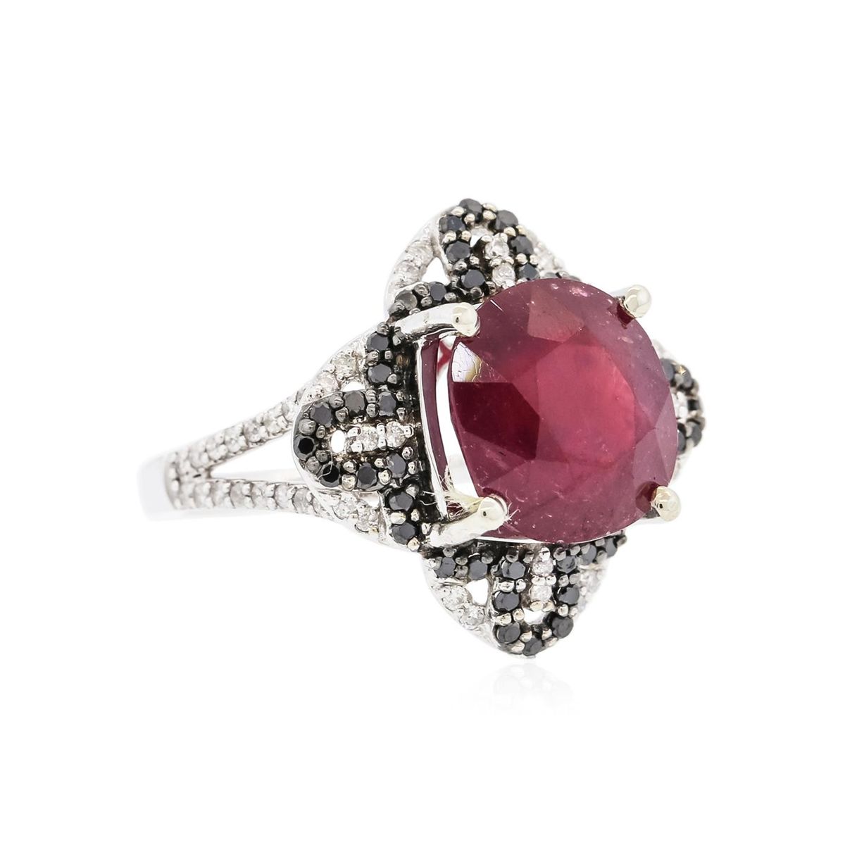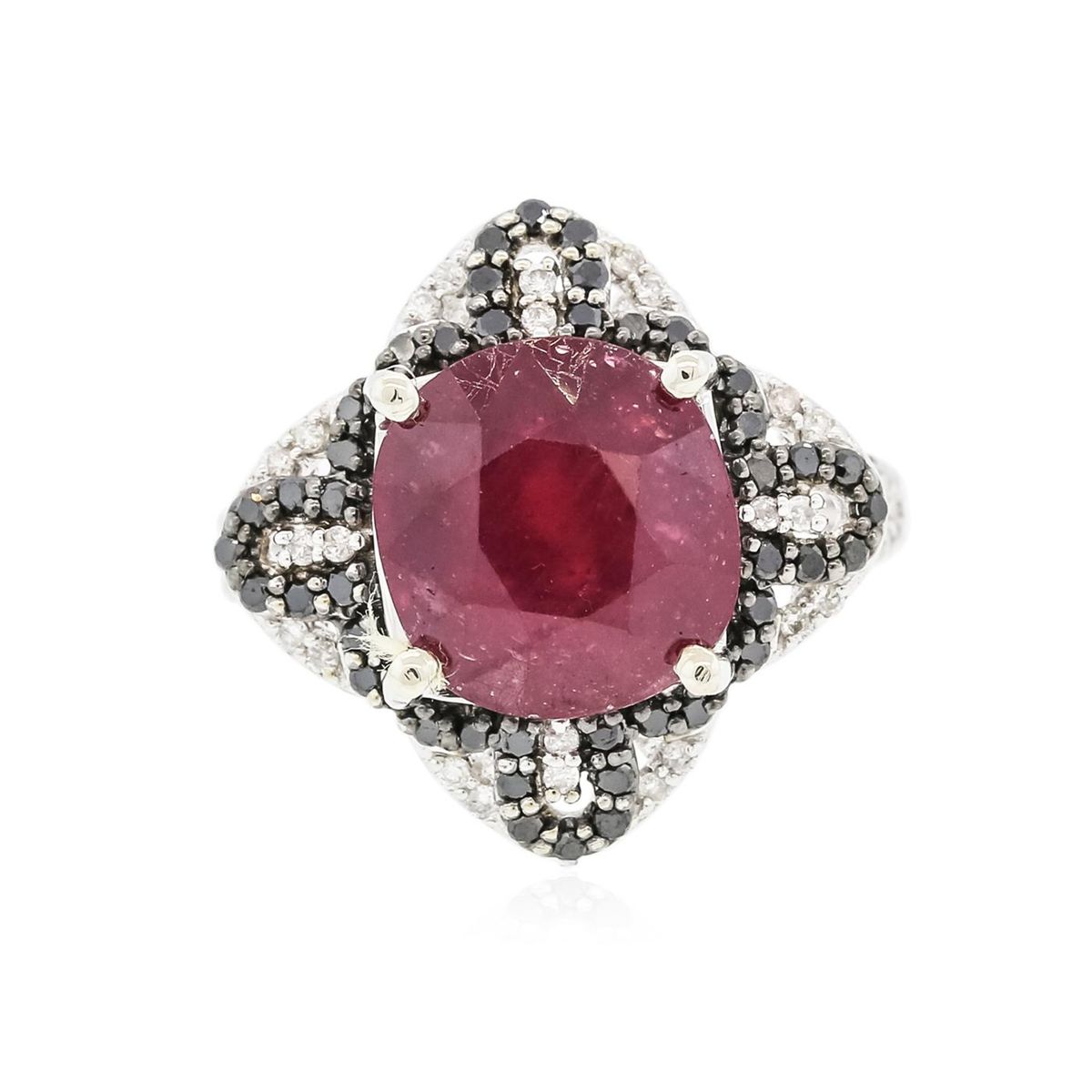 One electronically tested 14KT white gold ladies combination cast & assembled ring with a bright polish finish. Condition is new. Identified with markings of "14K". Containing: One prong set oval modified brilliant cut natural ruby, measuring 11.10 x 10.60 x 7.30mm, approximate weight of 6.87ct., clarity is heavily included, type II, medium dark, moderately strong, strongly purplish red color, (GIA stpR 6/4), cut is good. Fifty-Six prong set round brilliant cut diamonds, measuring 1.30 - 1.30 x 0.78mm (depth est.) approximate total weight of 56 Stones = 0.45ct. Clarity: I-1 to I-2. Color: I - J, Cut is Good. Forty-Four prong set round brilliant cut diamonds, measuring 1.30 - 1.30 x 0.00mm (depth est.) approximate total weight of 44 Stones = 0.00ct. Cut is Good. Colored gemstones are presumed to have been subjected to commonly used enhancement processes. All diamonds and colored gemstones are graded in the mounting, unless otherwise stated. Total Weight of Colored Stones 6.87ct. Total Weight of Diamonds 0.45ct. Total Weight of Ring 6.80 grams. GGL Appraised at $5,415.00.