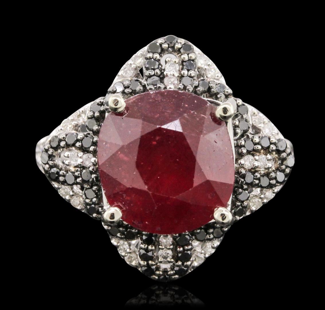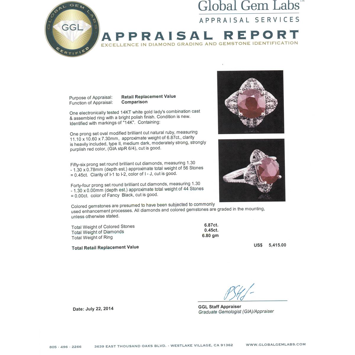 One electronically tested 14KT white gold ladies combination cast & assembled ring with a bright polish finish. Condition is new. Identified with markings of "14K". Containing: One prong set oval modified brilliant cut natural ruby, measuring 11.10 x 10.60 x 7.30mm, approximate weight of 6.87ct., clarity is heavily included, type II, medium dark, moderately strong, strongly purplish red color, (GIA stpR 6/4), cut is good. Fifty-Six prong set round brilliant cut diamonds, measuring 1.30 - 1.30 x 0.78mm (depth est.) approximate total weight of 56 Stones = 0.45ct. Clarity: I-1 to I-2. Color: I - J, Cut is Good. Forty-Four prong set round brilliant cut diamonds, measuring 1.30 - 1.30 x 0.00mm (depth est.) approximate total weight of 44 Stones = 0.00ct. Cut is Good. Colored gemstones are presumed to have been subjected to commonly used enhancement processes. All diamonds and colored gemstones are graded in the mounting, unless otherwise stated. Total Weight of Colored Stones 6.87ct. Total Weight of Diamonds 0.45ct. Total Weight of Ring 6.80 grams. GGL Appraised at $5,415.00.