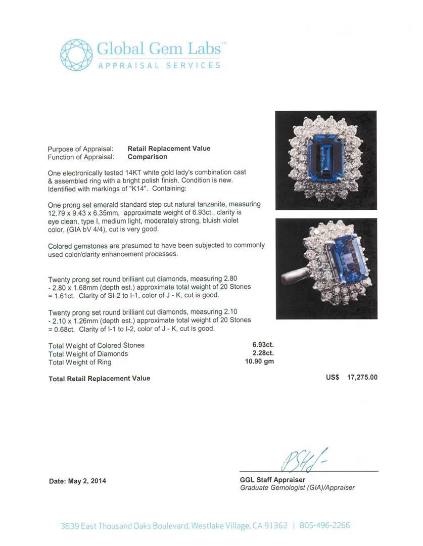 One electronically tested 14KT white gold Ladies combination cast & assembled ring with a bright polish finish. Condition is new. Identified with markings of "K14". Containing: One prong set emerald standard step cut natural tanzanite, measuring 12.79 x 9.43 x 6.35mm, approximate weight of 6.93ct., clarity is eye clean, type I, medium light, moderately strong, bluish violet color, (GIA bV 4/4), cut is very good. Colored gemstones are presumed to have been subjected to commonly used color/clarity enhancement processes. Twenty prong set round brilliant cut diamonds, measuring 2.80 - 2.80 x 1.68mm (depth est.) approximate. Total Weight of 20 Stones = 1.61ct. Clarity: SI-2 to I-1. Color: J - K, Cut is Good. Twenty prong set round brilliant cut diamonds, measuring 2.10 - 2.10 x 1.26mm (depth est.) approximate. Total Weight of 20 Stones = 0.68ct. Clarity: I-1 to I-2. Color: J - K, Cut is Good. Total Weight of Colored Stones 6.93ct. Total Weight of Diamonds 2.28ct. Total Weight of Ring 10.90 grams. GGL Appraised.