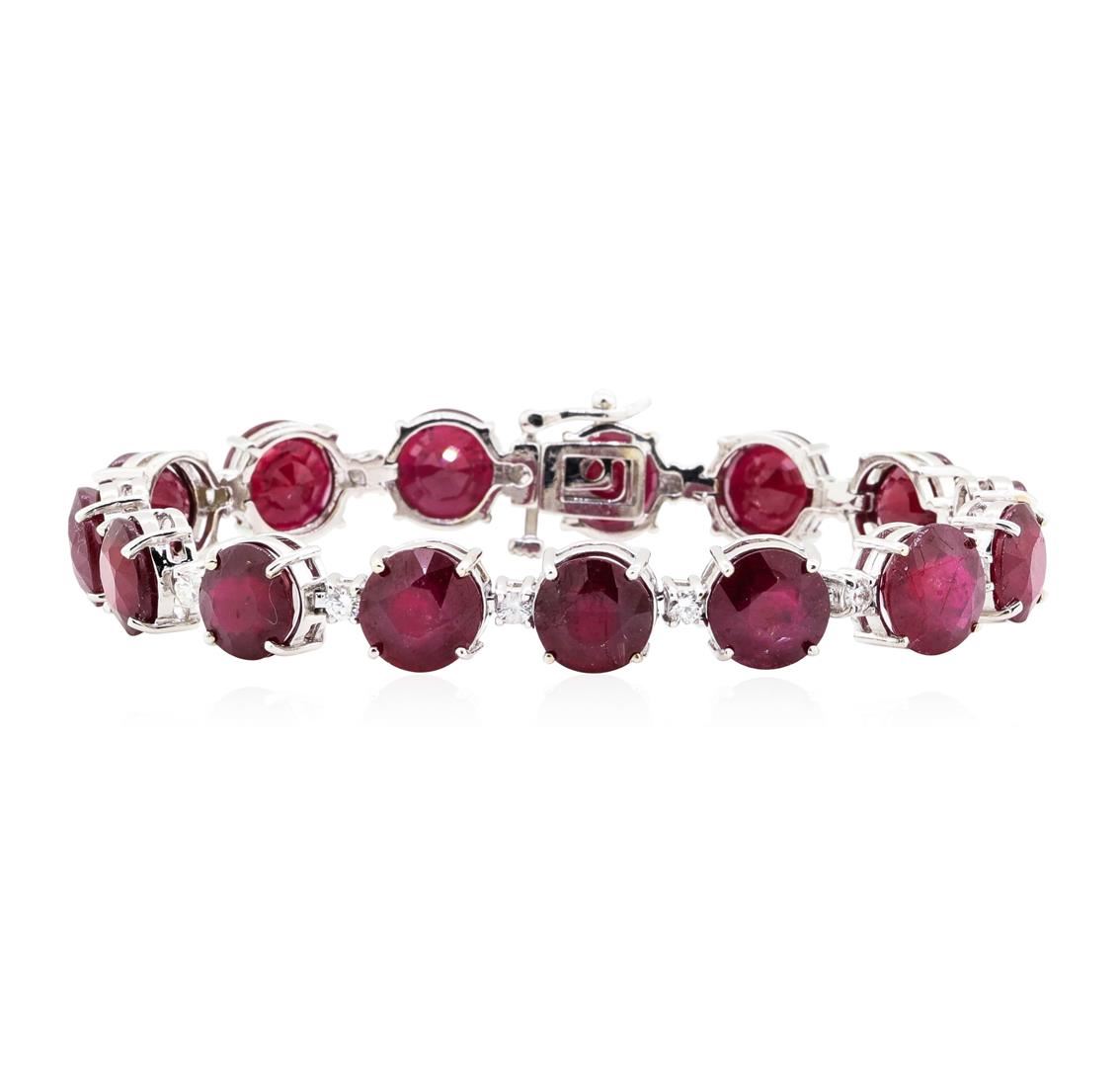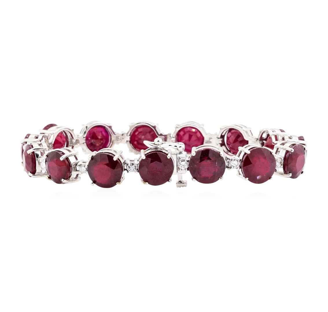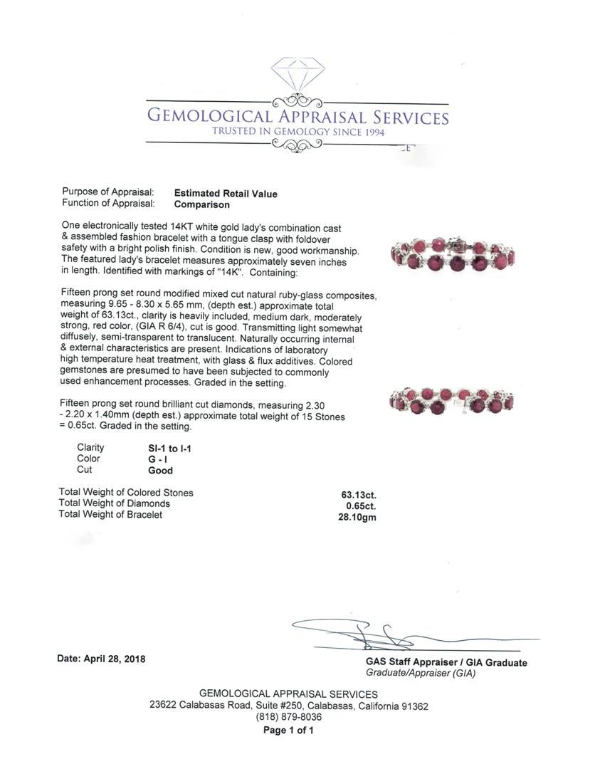 One electronically tested 14KT white gold Ladies combination cast & assembled fashion bracelet with a tongue clasp with foldover safety with a bright polish finish. The featured Ladies bracelet measures approximately seven inches in length. Identified with markings of '14K'. Condition is new, good workmanship. Containing: Fifteen prong set round modified mixed cut natural ruby-glass composites, measuring 9.65 - 8.30 x 5.65 mm, (depth est.) approximate total weight of 63.13ct., clarity is heavily included, medium dark, moderately strong, red color, (GIA R 6/4), cut is good. Transmitting light somewhat diffusely, semi-transparent to translucent. Naturally occurring internal & external characteristics are present. Indications of laboratory high temperature heat treatment, with glass & flux additives. Colored gemstones are presumed to have been subjected to commonly used enhancement processes. Graded in the setting. Fifteen prong set round brilliant cut diamonds, measuring 2.30 - 2.20 x 1.40mm (depth est.) approximate total weight of 15 Stones = 0.65ct. Graded in the setting. Color G - I Clarity SI-1 to I-1 Cut Good. Total Weight of Colored Stones 63.13ct.. Total Weight of Diamonds 0.65ct.. Total Weight of Bracelet 28.10gm. GAS Appraised.