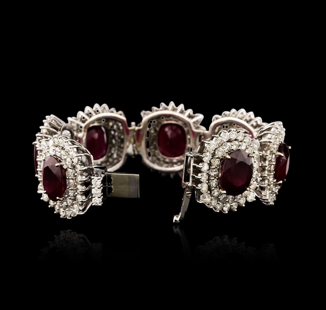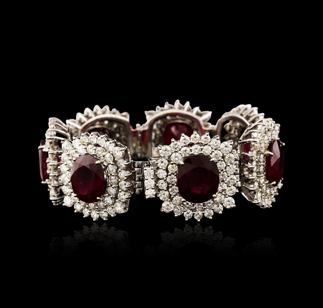 One electronically tested 14KT white gold ladies cast & assembled ruby and diamond bracelet. Six and three-quarter inch length bracelet features a series of ruby and diamond floret bezels, terminating in a concealed clasp with safety bar. Bright polish finish. Identified with markings of "14K". Condition is good. Containing: Seven prong set oval mixed cut natural rubies, measuring 14.00 x 12.00 x 6.40mm, 10% bulge factor, approximate total weight of 66.64ct., clarity is heavily included, type II, dark, very slightly brownish, slightly purplish red color, (GIA slpR 7/3), cut is good. Transmitting light somewhat diffusely, transparent to translucent. Naturally occurring internal & external characteristics are present. Indications of laboratory high temperature heat treatment, with glass & flux additives. Measurements & the color grade are an average for the group. Graded in the setting. Ruby has a low tolerance to rhodium plating, repolishing the surface,& ultrasonic cleaning. Two Hundred Sixty-Nine prong set round brilliant cut diamonds, measuring 3.50 - 3.00 x 1.95mm (depth est.) approximate total weight of 269 Stones = 33.88ct. Graded in the setting. Clarity: SI-1 to I-1. Color: J - L. Total Weight of Colored Stones 66.64ct. Total Weight of Diamonds 33.88ct. Total Weight of Bracelet 76.87 grams. AIG Appraised at $99,540.00.