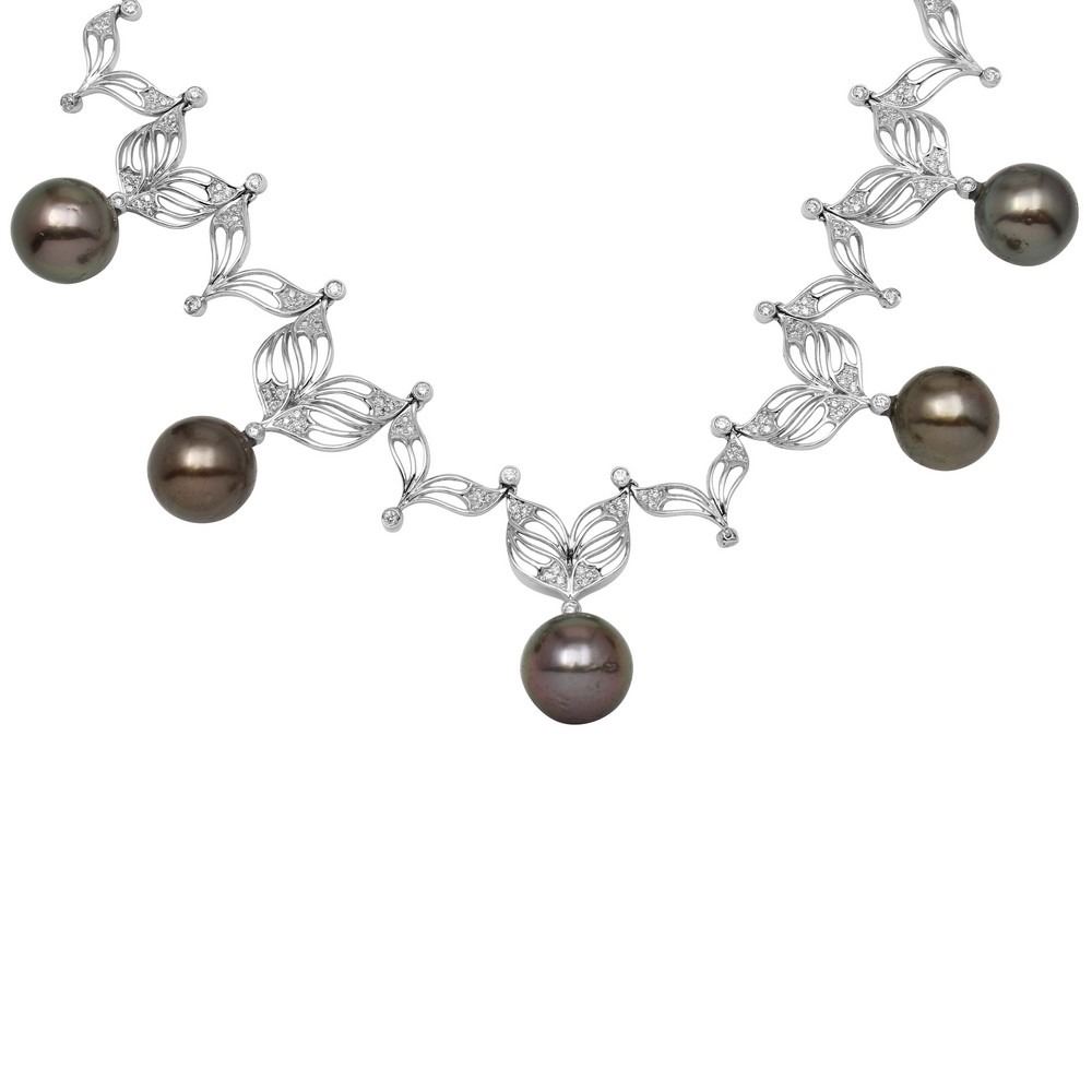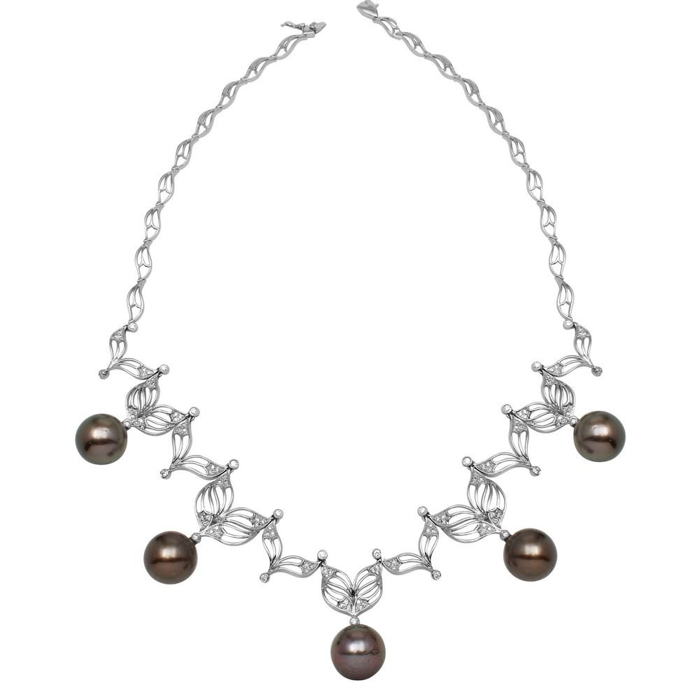 One 14KT White Gold 68.03ctw Tahitian Pearl and Diamond Necklace. (5) Tahitian pearls with a total weight of 68.03cts. (119) Diamonds with a total weight of 1.54cts with a color of I and clarity of I-1. Total weight of this necklace is 27.06 grams.