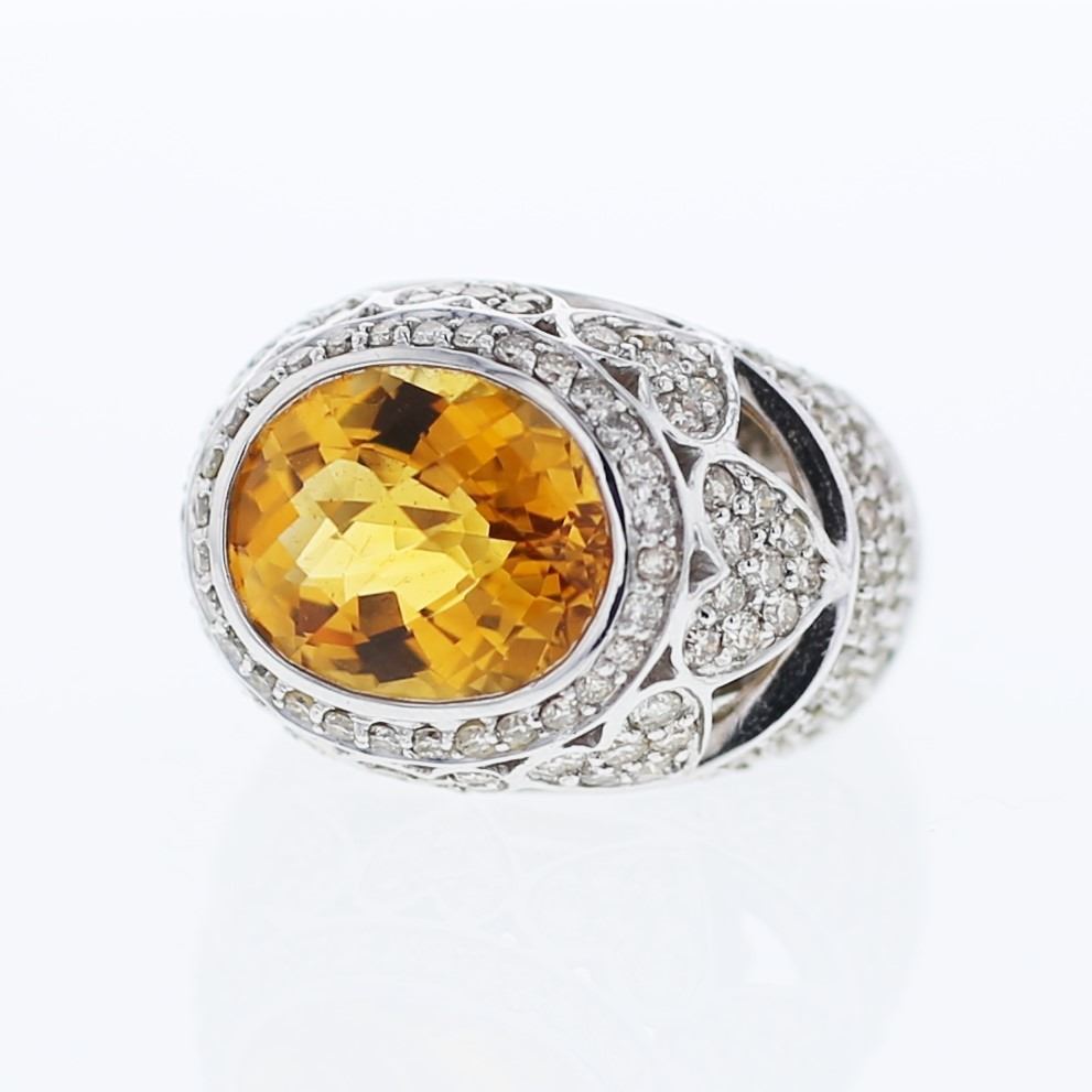 One 14KT White Gold 7.01ct Citrine and Diamond Ring. (1) Citrine stone with a total weight of 7.01cts. (154) Diamonds with a total weight of 2.98cts. Total weight of this ring is 13.4 grams.