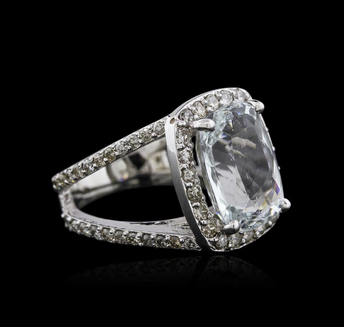 One electronically tested 14KT white gold ladies cast aquamarine and diamond ring with a split shank with a bright polish finish. Identified with markings of "K14". Condition is new. Containing: One prong set rectangular cushion modified brilliant cut natural aquamarine, measuring 14.48 x 10.99 x 6.95mm, approximate weight of 7.07ct., clarity is eye clean, type I, very light, slightly grayish, blue color, (GIA B 2/2), cut is good. Sixty-Six prong set round brilliant cut diamonds, measuring 1.70 - 1.70 x 1.02mm (depth est.) approximate total weight of 66 Stones = 1.18ct. Clarity: SI-1 to I-1. Color: I - J, Cut is Good. Diamonds and colored gemstones are graded in the mounting, unless otherwise stated. Colored gemstones are presumed to have been subjected to commonly used enhancement processes. Total Weight of Colored Stones 7.07ct. Total Weight of Diamonds 1.18ct. Total Weight of Ring 10.70 grams. GGL Appraised at $4,475.00.