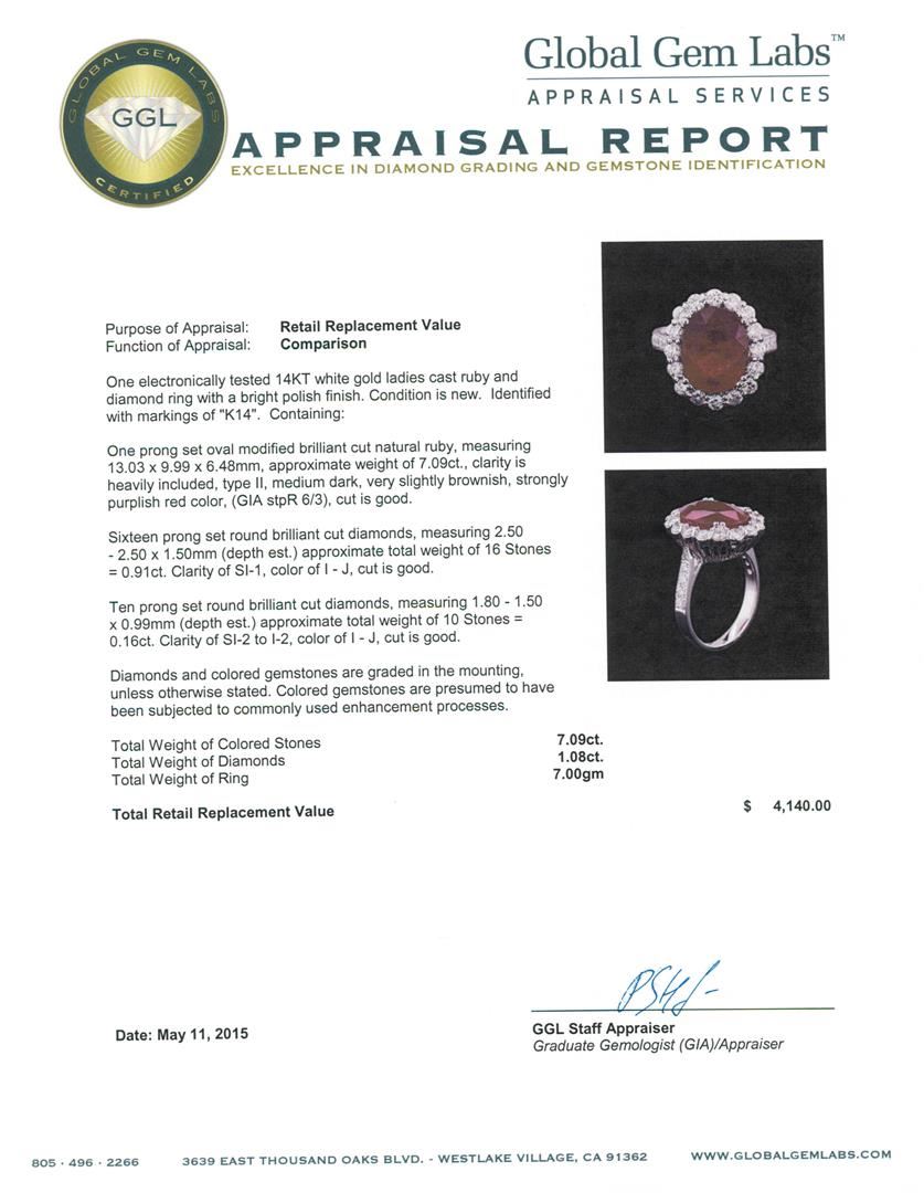 One electronically tested 14KT white gold ladies cast ruby and diamond ring with a bright polish finish. Identified with markings of "K14". Condition is new. Containing: One prong set oval modified brilliant cut natural ruby, measuring 13.03 x 9.99 x 6.48mm, approximate weight of 7.09ct., clarity is heavily included, type II, medium dark, very slightly brownish, strongly purplish red color, (GIA stpR 6/3), cut is good. Sixteen prong set round brilliant cut diamonds, measuring 2.50 - 2.50 x 1.50mm (depth est.) approximate total weight of 16 Stones = 0.91ct. Clarity: SI-1. Color: I - J, Cut is Good. Ten prong set round brilliant cut diamonds, measuring 1.80 - 1.50 x 0.99mm (depth est.) approximate total weight of 10 Stones = 0.16ct. Clarity: SI-2 to I-2. Color: I - J, Cut is Good. Diamonds and colored gemstones are graded in the mounting, unless otherwise stated. Colored gemstones are presumed to have been subjected to commonly used enhancement processes. Total Weight of Colored Stones 7.09ct. Total Weight of Diamonds 1.08ct. Total Weight of Ring 7.00 grams. GGL Appraised at $4,140.00.